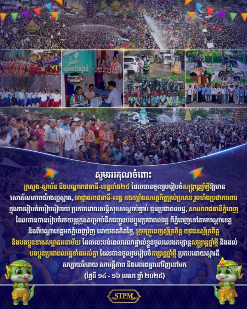 តាមរយៈបណ្តាញសង្គមហ្វេសបុក និងតេលេក្រាម នាព្រឹកថ្ងៃទី១៧ ខែមេសា ឆ្នាំ២០២៥នេះ សម្តេចធិបតី ហ៊ុន ម៉ាណែត នាយករដ្ឋមន្រ្តីបានលើកឡើងថា« ក្នុងនាមរាជរដ្ឋាភិបាល និងក្នុងនាមខ្លួនខ្ញុំផ្ទាល់ ខ្ញុំសូមថ្លែងអំណរគុណយ៉ាងជ្រាលជ្រៅចំពោះក្រសួង-ស្ថាប័ន អាជ្ញាធរដែនដីគ្រប់លំដាប់ថ្នាក់ គ្រប់រាជធានី-ខេត្ត ក៏ដូចជានៅក្រៅប្រទេស កងយោធពលខេមរភូមិន្ទ កងនគរបាលជាតិ កងរាជអាវុធហត្ថ ប្រជាការពារ អ្នកអនាម័យ និងកម្លាំងស្ម័គ្រចិត្តគ្រប់យន្តការទាំងអស់ ដែលបានចូលរួមសហការបំពេញភារកិច្ចរៀបចំ តុបតែង និងប្រចាំការការពារសន្តិសុខសណ្តាប់ធ្នាប់ ធានាបាននូវសុវត្ថិភាព បង្កលក្ខណៈដល់ការកម្សាន្តសប្បាយរបស់លោកតាលោកយាយ អ៊ំពូមីង បងប្អូន ព្រមទាំងបានញ៊ាំងឱ្យការប្រារព្ធពិធីបុណ្យចូលឆ្នាំថ្មីប្រពៃណីជាតិខ្មែរ ឆ្នាំម្សាញ់ សប្ដស័ក ព.ស ២៥៦៨ នៅទូទាំងប្រទេស បានប្រព្រឹត្តទៅដោយភាពសប្បាយរីករាយ សោភ័ណភាព សេចក្តីថ្លៃថ្នូរ សុខសុវត្ថិភាព របៀបរៀបរយល្អ ប្រកបដោយមោទកភាពជាតិ»។