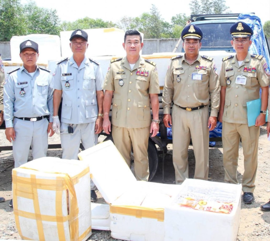 នៅថ្ងៃទី២១ ខែមេសា ឆ្នាំ២០២៥ ដោយអនុវត្តតាមបទបញ្ជារបស់ឯកឧត្តម ឧត្តមសេនីយ៍ឯក ជួន ណារិន្ទ អគ្គស្នងការរង និងជាស្នងការនគរបាលរាជធានីភ្នំពេញ និងលោកឧត្តមសេនីយ៍ទោ ពិត បញ្ញា ស្នងការរង ផែនការងារនគរបាលប្រឆាំងបទល្មើសសេដ្ឋកិច្ច កម្លាំងការិយាល័យនគរបាលប្រឆាំងបទល្មើសសេដ្ឋកិច្ច ដឹកនាំបង្ក្រាបដោយលោកវរសេនីយ៍ឯក យឹម សុជាតិ នាយការិយាល័យនគរបាលប្រឆាំងបទល្មើសសេដ្ឋកិច្ច សហការជាមួយ ក.ប.ប. រាជធានីភ្នំពេញ បានធ្វើបង្ក្រាបសាច់ក្រក ចំនួន៩កេស ស្មើនឹង ៤៥០គីឡូក្រាម ចង្រិតដូង ចំនួន១០កេស ស្មើនឹង ៤០០គីឡូក្រាម និងចង្រិតធម្មតា ចំនួន១១កេស ស្មើនឹង៥៥០គីឡូក្រាម ដែលខូចគុណភាព សរុបចំនួន៣០កេស ស្មើនឹង ១៤០០គីឡូក្រាម គ្មានឯកសារបញ្ជាក់ពីប្រភពច្បាស់លាល់ និងមិនអនុលោមភាពផ្នែកបទដ្ឋានព័ត៌មានលក្ខខ័ណ្ឌតម្រូវម្ហូបអាហារ ដែលធ្វើឱ្យប៉ះពាល់ដល់សុខភាពប្រជាពលរដ្ឋជាអ្នកប្រើប្រាស់។