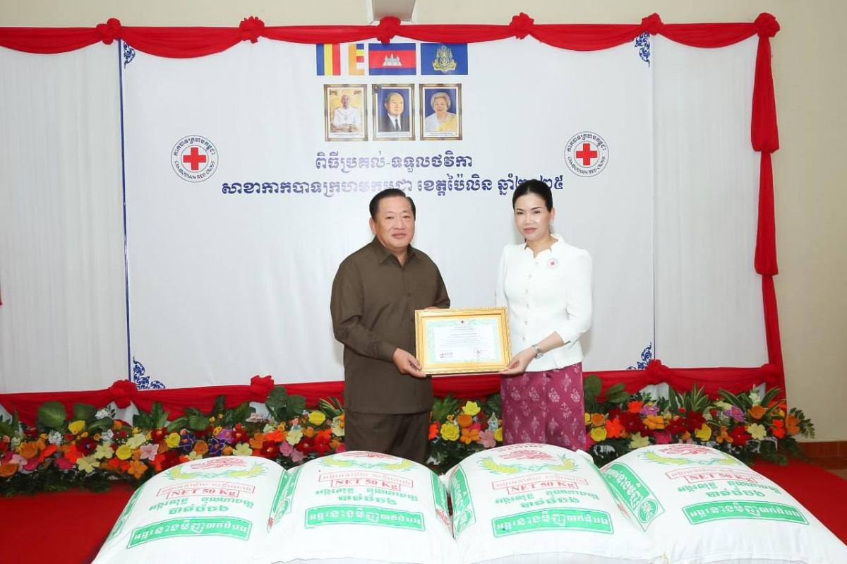 ប៉ៃលិន៖ ព្រឹកថ្ងៃទី០៧ ខែឧសភា នេះ លោកជំទាវបណ្ឌិត បាន ស្រីមុំ អភិបាលខេត្តប៉ៃលិន និងជាប្រធាន គណៈកម្មាធិការសាខាកាកបាទក្រហមកម្ពុជាខេត្ត បានអញ្ជើញជាអធិបតីក្នុងពិធីទទួលអំណោយមនុស្ស ធម៌ជាថវិកា និងគ្រឿងឧបភោគបរិភោគមួយចំនួន ពីសប្បុរសជននានា ក្នុងឱកាសខួបទី១៦២ ទិវាពិភព លោកកាកបាទក្រហម និងអឌ្ឍចន្ទក្រហម ៨ ឧសភា ឆ្នាំ២០២៥ និងខួបលើកទី៧០ឆ្នាំ នៃកាកបាទ ក្រហមកម្ពុជា ក្រោមមូលបទ «រួមគ្នាស្ម័គ្រចិត្ត ដើម្បីសហគមន៍មានសុខភាពល្អ និងមានភាពធន់នឹងអា កាសធាតុ»។