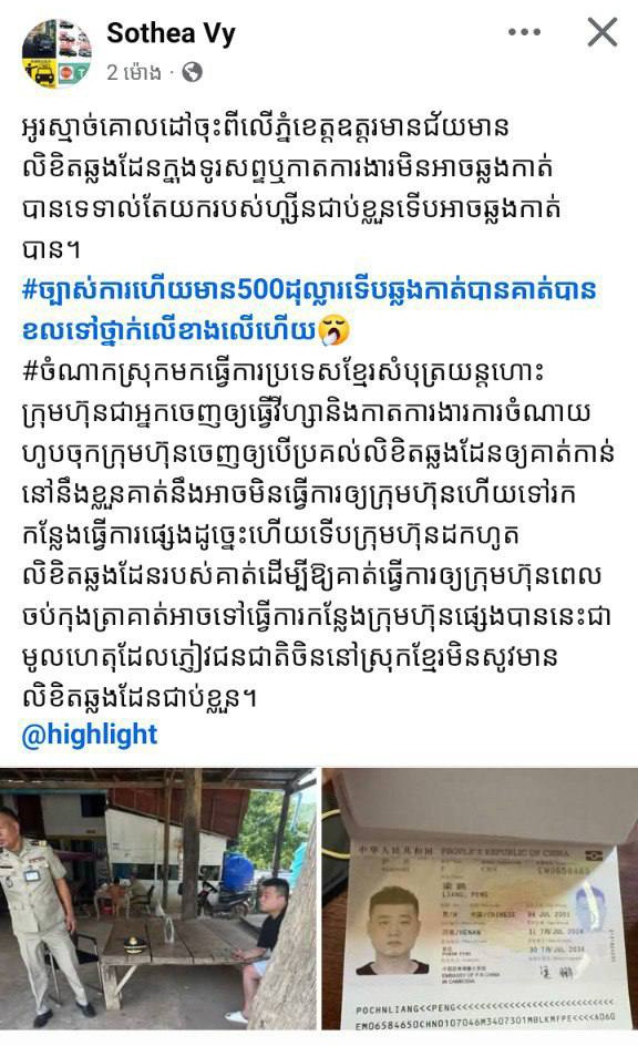 ទាក់ទិនបញ្ហានេះដែរ អ្នកនាំពាក្យ និងក្រុមការងារប្រតិកម្មរហ័សនៃស្នងការដ្ឋាននគរបាលខេត្តឧត្តរមានជ័យ កាលពីថ្ងៃទី២៣ ខែឧសភា ឆ្នាំ២០២៥ បានចេញសេចក្តីបំភ្លឺព័ត៌មានជូនអ្នកនិយមតាមដានព័ត៌មាននៅលើបណ្តាញទំនាក់ទំនងសង្គម Facebook និងសាធារណជន ឲ្យដឹងដែរថា នៅថ្ងៃទី២៣ ខែឧសភា ឆ្នាំ២០២៥ វេលាម៉ោង ១០ និង៤៨នាទី មានរូបភាព និងសារសម្លេង បានបង្ហោះចែកចាយព័ត៌មានតាមគណនី Facebook និងប្រព័ន្ធ Telegram មានខ្លឹមសាររៀបរាប់របស់ប្រជាពលរដ្ឋ ដែលចោទប្រកាន់មកលើសមត្ថកិច្ចខេត្តឧត្តរមានជ័យ គោលដៅចរាចរណ៍ផ្លូវឡើងអូរស្មាច់ យកលុយពីជនបរទេសចំនួន ៥០០ដុល្លា ព្រោះជនបរទេស ទាំងនោះមានលិខិតឆ្លងដែនក្នុងទូរស័ព្ទ ចំណែករបស់ហ្ស៊ីនពួកគាត់នៅឯក្រុមហ៊ុនរក្សាទុក។