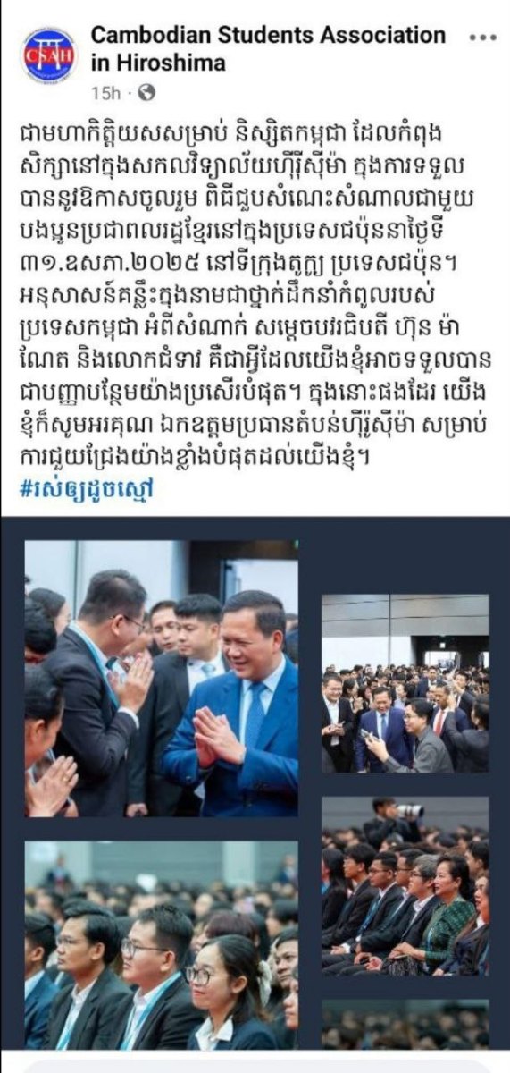 លើសពីនេះ មានក្រុមសមាគមនិស្សិតខ្មែរដែលកំពុងសិក្សានៅសកលវិទ្យាល័យហ៊ីរ៉ីស៊ីម៉ា បានបង្ហាញពីក្ដីរំភើបរីករាយនៅក្នុងឱកាសជួបសម្តេចបវរធិបតី ហ៊ុន ម៉ាណែត និងលោកជំទាវ ក្នុងពិធីជួបសំណេះសំណាលជាមួយបងប្អូនប្រជាពលរដ្ឋខ្មែរនៅក្នុងប្រទេសជប៉ុន។