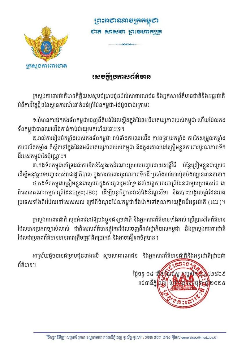 ក្រសួងការពារជាតិ បានជម្រាបជូនដល់សាធារណជន និងអ្នកសារព័ត៌មានជាតិ និងអន្តរជាតិថា៖