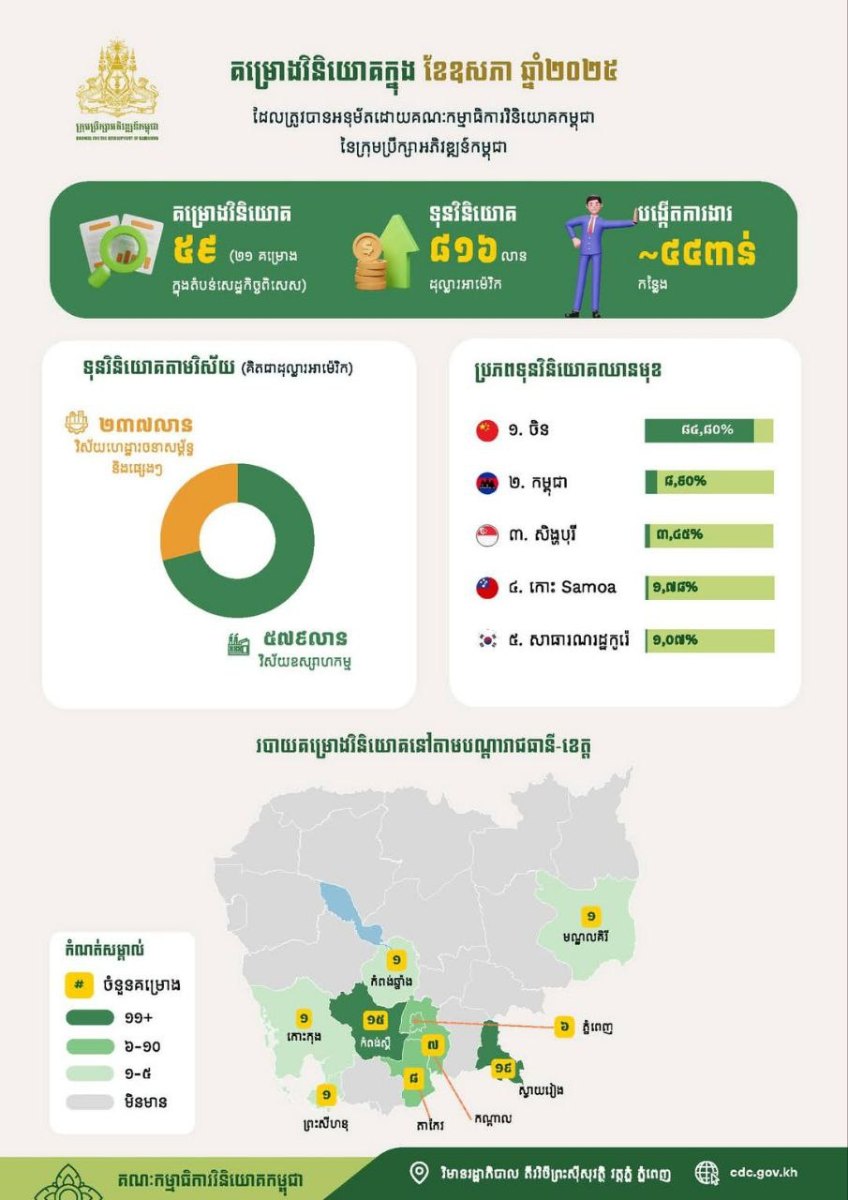 ក្រុមប្រឹក្សាអភិវឌ្ឍន៍កម្ពុជា (CDC) នៅព្រឹកថ្ងៃទី១០ ខែមិថុនា ឆ្នាំ២០២៥នេះ បានចេញសេចក្តីប្រកាសព័ត៌មានបញ្ជាក់ឱ្យដឹងថា ក្នុងខែឧសភា ឆ្នាំ២០២៥ ខ្លួនបានចុះបញ្ជីគម្រោងវិនិយោគចំនួន៥៩ ដែលមានទុនវិនិយោគសរុបប្រមាណ៨១៦លានដុល្លារអាម៉េរិក។