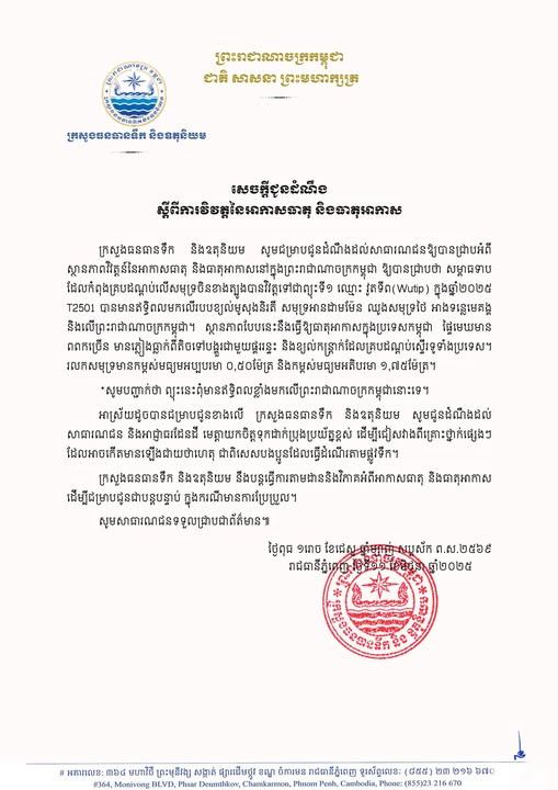 ក្រសួងធនធានទឹកឱ្យដឹងថា សម្ពាធទាបដែលកំពុងគ្របដណ្តប់លើសមុទ្រចិនខាងត្បូងបានវិវត្តទៅជាព្យុះទី១ ឈ្មោះ វុតទីព (Wutp) ក្នុងឆ្នាំ២០២៥ T250 បានមានឥទ្ធិពលមកលើរបបខ្យល់មូសុងនិរតី សមុទ្រអានដាមម៉ែន ឈូងសមុទ្រថៃ អាងទន្លេមេគង្គ និងលើព្រះរាជាណាចក្រកម្ពុជា។