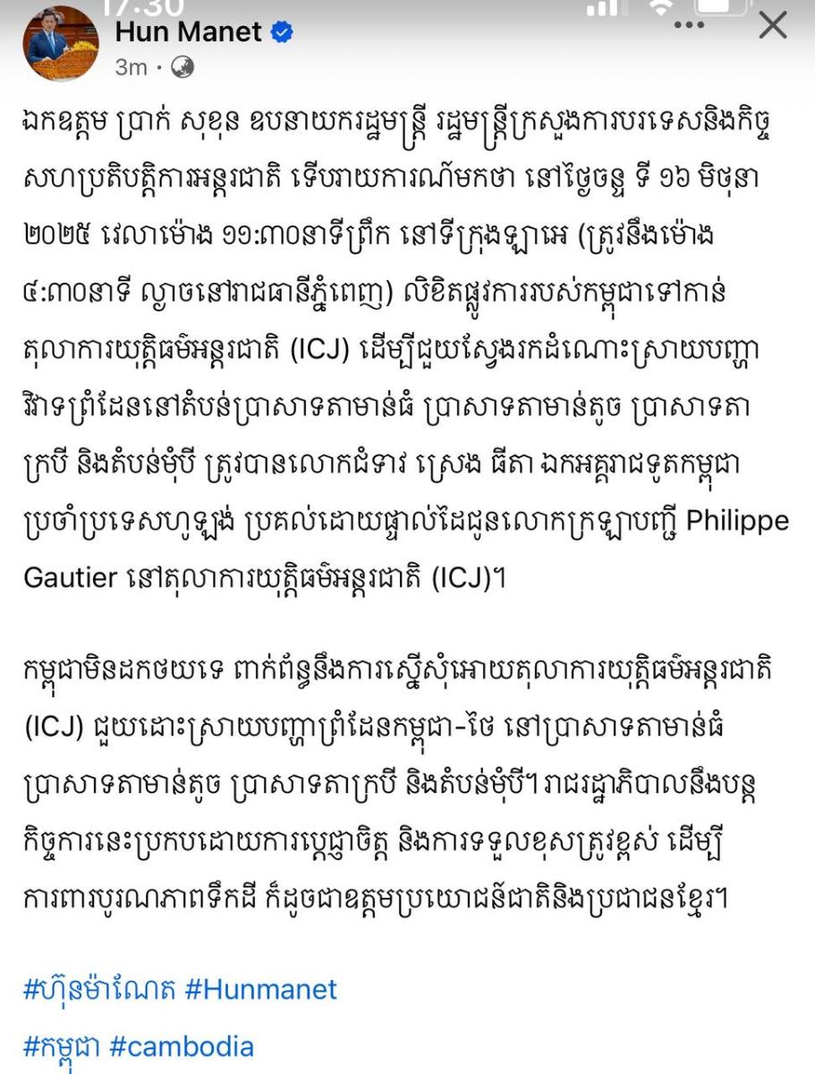 សម្ដេចធិបតី ហ៊ុន ម៉ាណែត នាយករដ្ឋមន្រ្ដីនៃកម្ពុជា បានបញ្ជាក់នៅលើបណ្ដាញសង្គមនៅថ្ងៃនេះថា ឯកឧត្តម ប្រាក់ សុខុន ឧបនាយករដ្ឋមន្ត្រី រដ្ឋមន្ត្រីក្រសួងការបរទេស និងកិច្ចសហប្រតិបត្តិការអន្តរជាតិទើបរាយការណ៍មកថា នៅថ្ងៃចន្ទទី ១៦ មិថុនា ២០២៥ វេលាម៉ោង ១១:៣០ នាទីព្រឹក នៅទីក្រុងឡាអេ (ត្រូវនឹងម៉ោង ៤:៣០នាទី ល្ងាចនៅរាជធានីភ្នំពេញ)ថាលិខិតផ្លូវការរបស់កម្ពុជាទៅកាន់តុលាការយុត្តិធម៌អន្តរជាតិ (ICJ) ដើម្បីជួយស្វែងរកដំណោះស្រាយបញ្ហាវិវាទព្រំដែននៅតំបន់ប្រាសាទតាមាន់ធំ ប្រាសាទតាមាន់តូច ប្រាសាទតាក្របី និងតំបន់មុំបី ត្រូវបានលោកជំទាវ គឹមសួគ៌ សុវណ្ណារី ឯកអគ្គរាជទូតកម្ពុជាប្រចាំប្រទេសហូឡង់ ប្រគល់ដោយផ្ទាល់ដៃជូនលោកក្រឡាបញ្ជី Philippe Gautier នៅតុលាការយុត្តិធម៌អន្តរជាតិ (ICJ)។