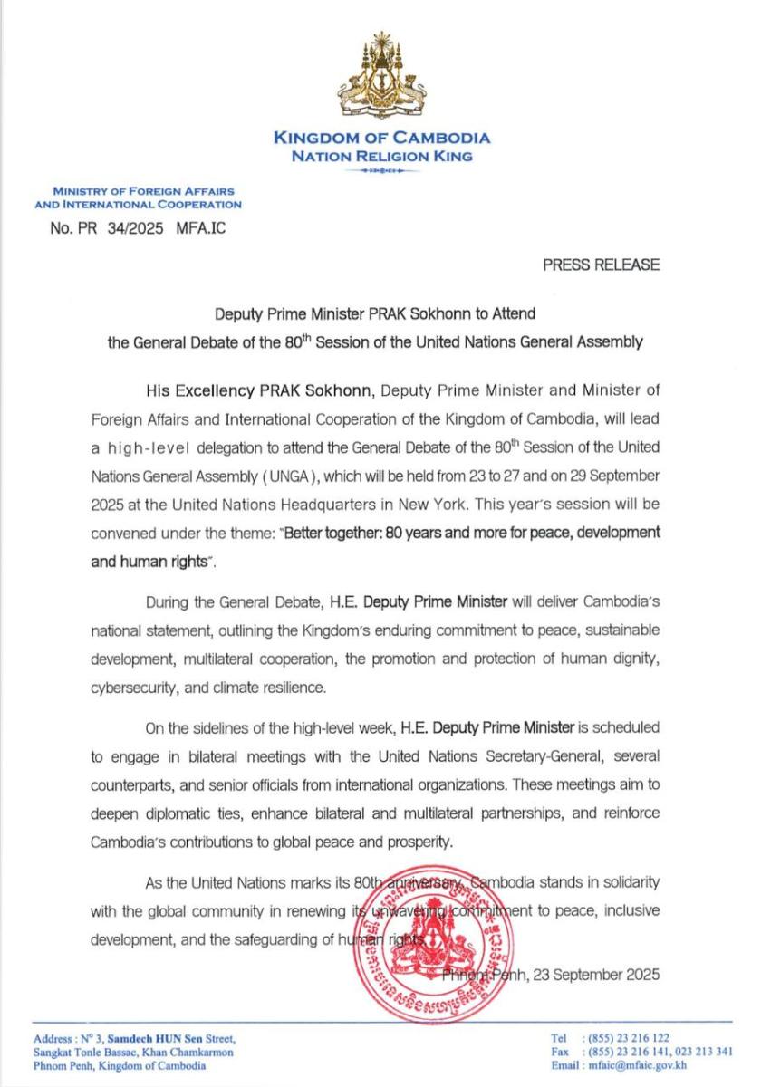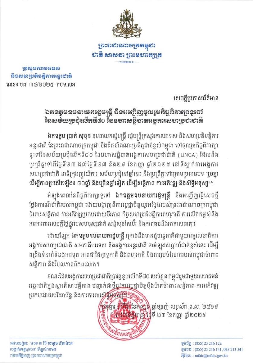 ឯកឧត្តម ប្រាក់ សុខុន ឧបនាយករដ្ឋមន្ត្រី រដ្ឋមន្ត្រីក្រសួងការបរទេស និងសហប្រតិបត្តិការ អន្តរជាតិ នៃព្រះរាជាណាចក្រកម្ពុជា នឹងដឹកនាំគណៈប្រតិភូជាន់ខ្ពស់កម្ពុជា ទៅចូលរួមកិច្ចពិភាក្សាទូទៅ នាសម័យប្រជុំលើកទី៨០ នៃមហាសន្និបាតអង្គការសហប្រជាជាតិ (UNGA) ដែលនឹងប្រព្រឹត្តទៅពីថ្ងៃទី២៣ ដល់ថ្ងៃទី២៧ និង២៩ ខែកញ្ញា ឆ្នាំ២០២៥ នៅទីស្នាក់ការអង្គការសហប្រជាជាតិ នាទីក្រុងញូវយ៉ក។ នេះបើយោងតាមសេចក្ដីប្រកាសព័ត៌មានរបស់ក្រសួងការបរទេស និងសហប្រតិបត្តិការអន្តរជាតិ នៃព្រះរាជាណាចក្រកម្ពុជា។