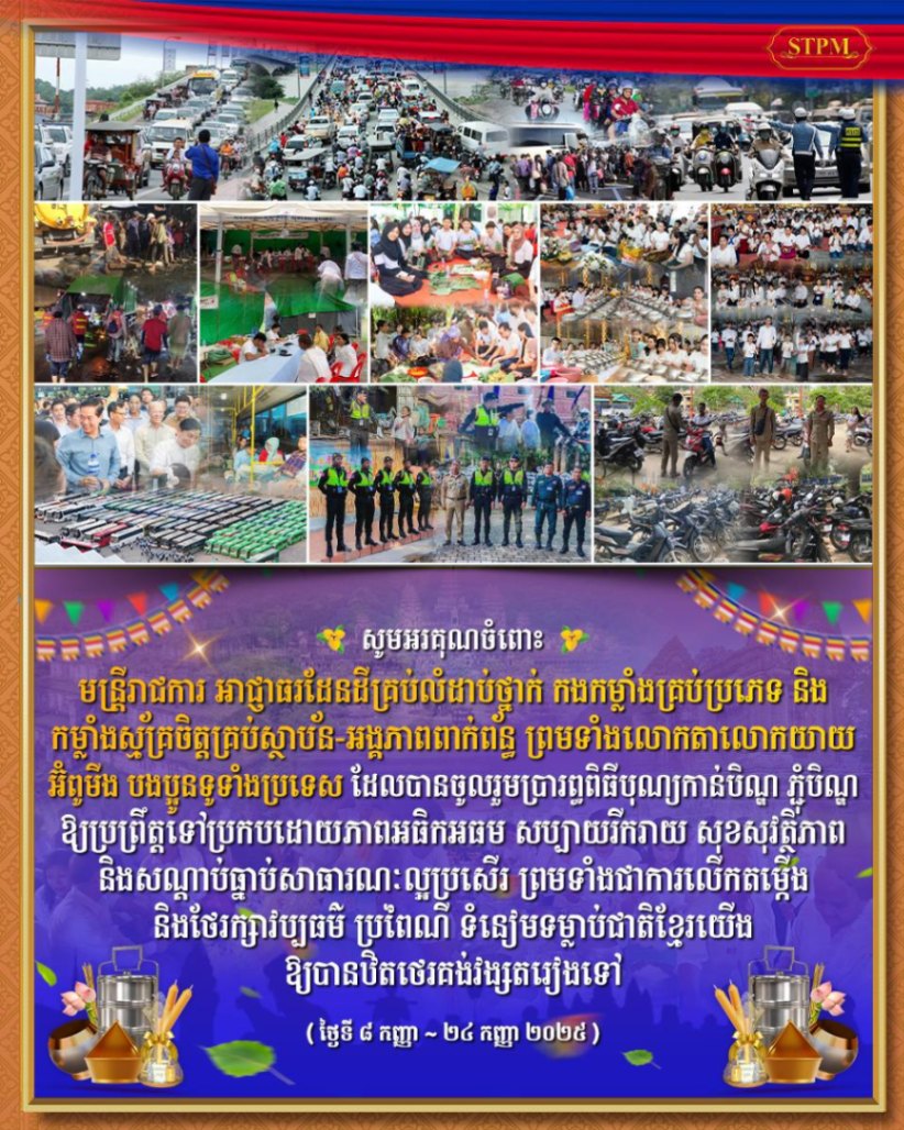 សម្ដេចធិបតី នាយករដ្ឋមន្រ្ដី បានវាយតម្លៃខ្ពស់ចំពោះមន្រ្ដីរាជការគ្រប់លំដាក់ថ្នាក់ កម្លាំងសមត្ថកិច្ច និងអ្នកពាក់ព័ន្ធទាំអស់ដែលនៅប្រចាំការបម្រើការពារសុខសុវត្ថិភាពជូនបងប្អូនប្រជាពលរដ្ឋនៅក្នុងអំឡុងនៃការប្រារព្ធពិធីបុណ្យភ្ជុំបិណ្ឌនេះ។