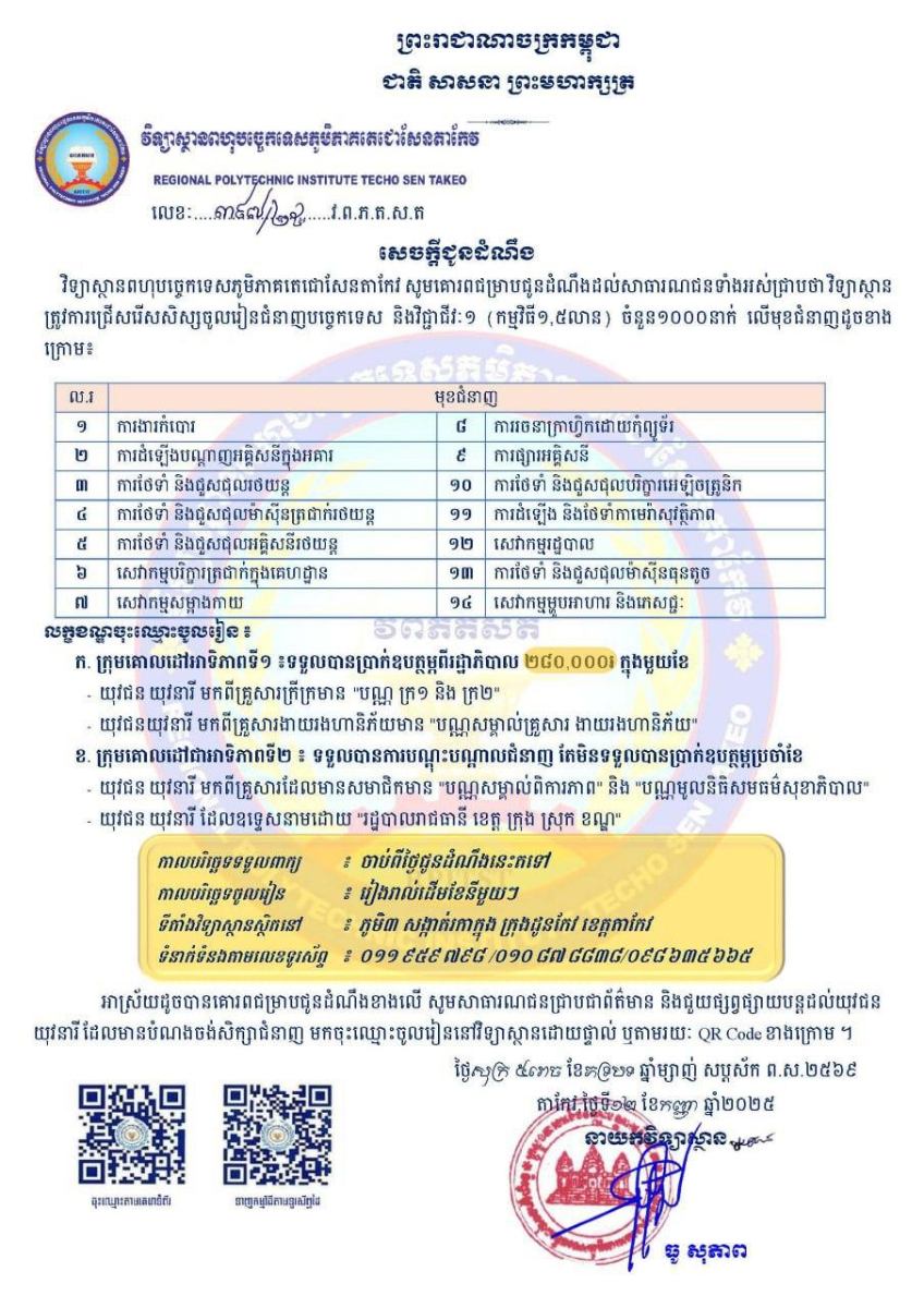 ការសិក្សាវគ្គថ្មី នឹងចាប់ផ្តើមរៀងរាល់ដើមខែនីមួយៗ។ សម្រាប់ព័ត៌មានអំពីការចុះឈ្មោះចូលរៀន សូមទាក់ទងទៅកាន់ទូរសព្ទលេខ ០៩៨ ៥២២ ៦៤៥/០១០ ៨៧៨ ៨៣៨/០៩៨ ៦៣៥ ៦៦៥ ឬ អញ្ជើញមកវិទ្យាស្ថានពហុបច្ចេកទេសភូមិភាគតេជោសែនតាកែវ ដោយផ្ទាល់ដែលមានអាសយដ្ឋាននៅភូមិ៣ សង្កាត់រកាក្នុង ក្រុងដូនកែវ ខេត្តតាកែវ៕