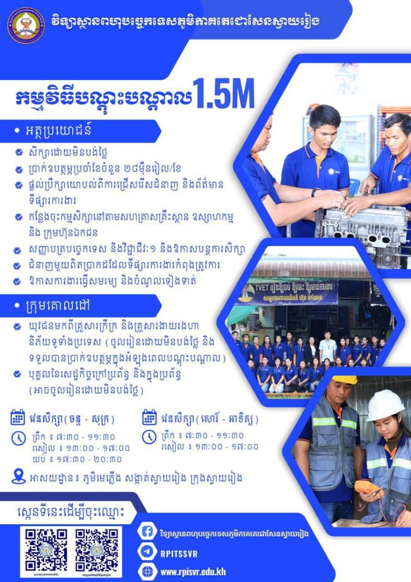វិទ្យាស្ថានពហុបច្ចេកទេសភូមិភាគតេជោសែនស្វាយរៀង នៃក្រសួងការងារ និងបណ្តុះបណ្តលវិជ្ជាជីវៈ ផ្តល់អាហារូបករណ៍ចំនួន ១៣២៥កន្លែង លើ ១២មុខជំនាញ ដល់យុវជនមកពីគ្រួសារក្រីក្រ និងគ្រួសារងាយរងហានិភ័យ ព្រមទាំងផ្ដល់ប្រាក់ឧបត្ថម្ភប្រចាំខែក្រោមកម្មវិធីបណ្តុះបណ្តាលជំនាញវិជ្ជាជីវៈ និងបច្ចេកទេសដល់យុវជនមកពីគ្រួសារក្រីក្រ និងគ្រួសារងាយរងហានិភ័យ (TVET 1.5M)។ សម្រាប់ប្រជាពលរដ្ឋ និងយុវជន ដែលមិនមែនជាក្រុមគោលដៅ ក៏អាចស្នើចុះឈ្មោះចូលសិក្សាបានដោយឥតគិតថ្លៃផងដែរ ប៉ុន្តែមិនទទួលបានប្រាក់ឧបត្ថម្ភនោះឡើយ។