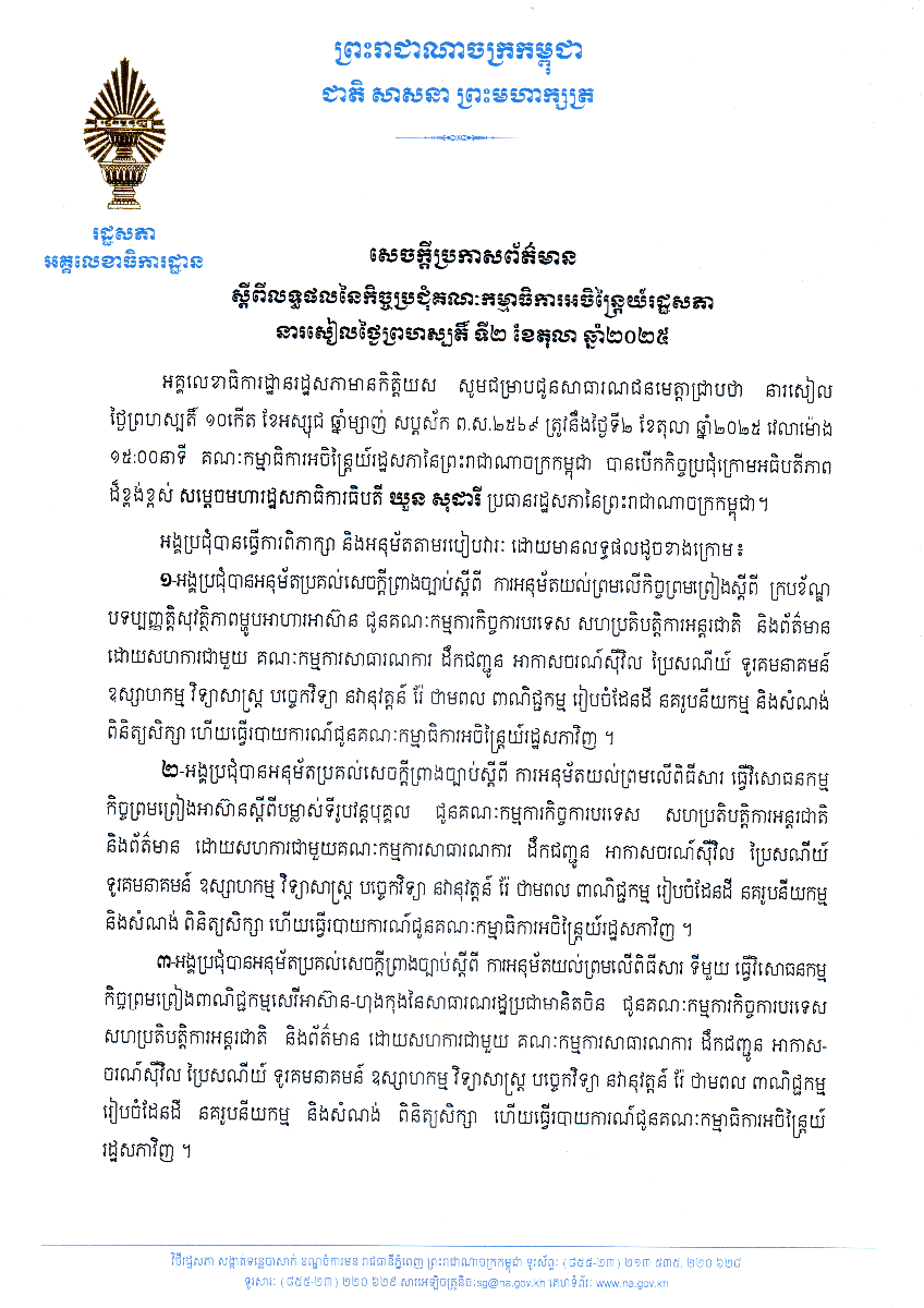 អគ្គលេខាធិការដ្ឋានរដ្ឋសភា បានឱ្យដឹងថា រសៀល ថ្ងៃទី២ ខែតុលា ឆ្នាំ២០២៥ នេះ គណៈកម្មាធិការអចិន្ត្រៃយ៍រដ្ឋសភា នៃព្រះរាជាណាចក្រកម្ពុជា បានបើកកិច្ចប្រជុំក្រោមអធិបតីភាព ដ៏ខ្ពង់ខ្ពស់ សម្ដេចមហារដ្ឋសភាធិការធិបតី ឃួន សុដារី ប្រធានរដ្ឋសភា នៃព្រះរាជាណាចក្រកម្ពុជា។