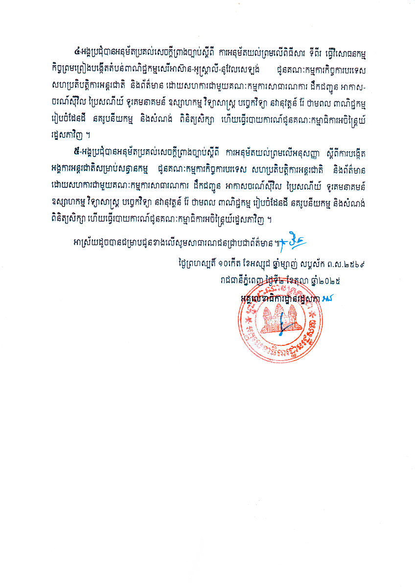 ៤- អង្គប្រជុំបានអនុម័តប្រគល់សេចក្តីព្រាងច្បាប់ស្តីពី ការអនុម័តយល់ព្រមលើពិធីសារទីពីរ ធ្វើវិសោធនកម្ម កិច្ចព្រមព្រៀងបង្កើតតំបន់ពាណិជ្ជកម្មសេរីអាស៊ាន-អូស្ត្រាលី-នូវែលសេឡង់ ជូនគណៈកម្មការកិច្ចការបរទេស សហប្រតិបត្តិការអន្តរជាតិ និងព័ត៌មាន ដោយសហការជាមួយគណៈកម្មការសាធារណការ ដឹកជញ្ជូន អាកាស- ចរណ៍ស៊ីវិល ប្រៃសណីយ៍ ទូរគមនាគមន៍ ឧស្សាហកម្ម វិទ្យាសាស្ត្រ បច្ចេកវិទ្យា នវានុវត្តន៍ រ៉ែ ថាមពល ពាណិជ្ជកម្ម រៀបចំដែនដី នគរូបនីយកម្ម និងសំណង់ ពិនិត្យសិក្សា ហើយធ្វើរបាយការណ៍ជូនគណៈកម្មាធិការអចិន្ត្រៃយ៍ រដ្ឋសភាវិញ។