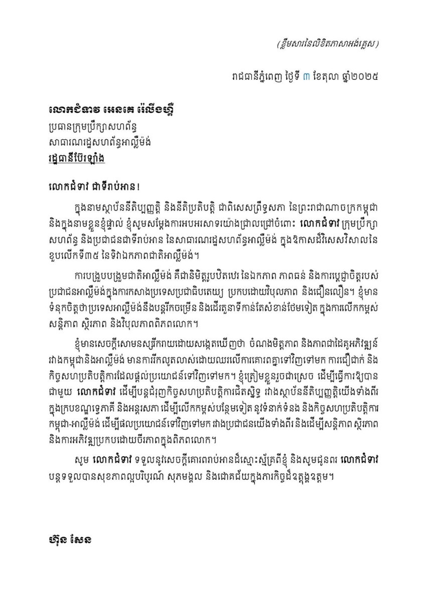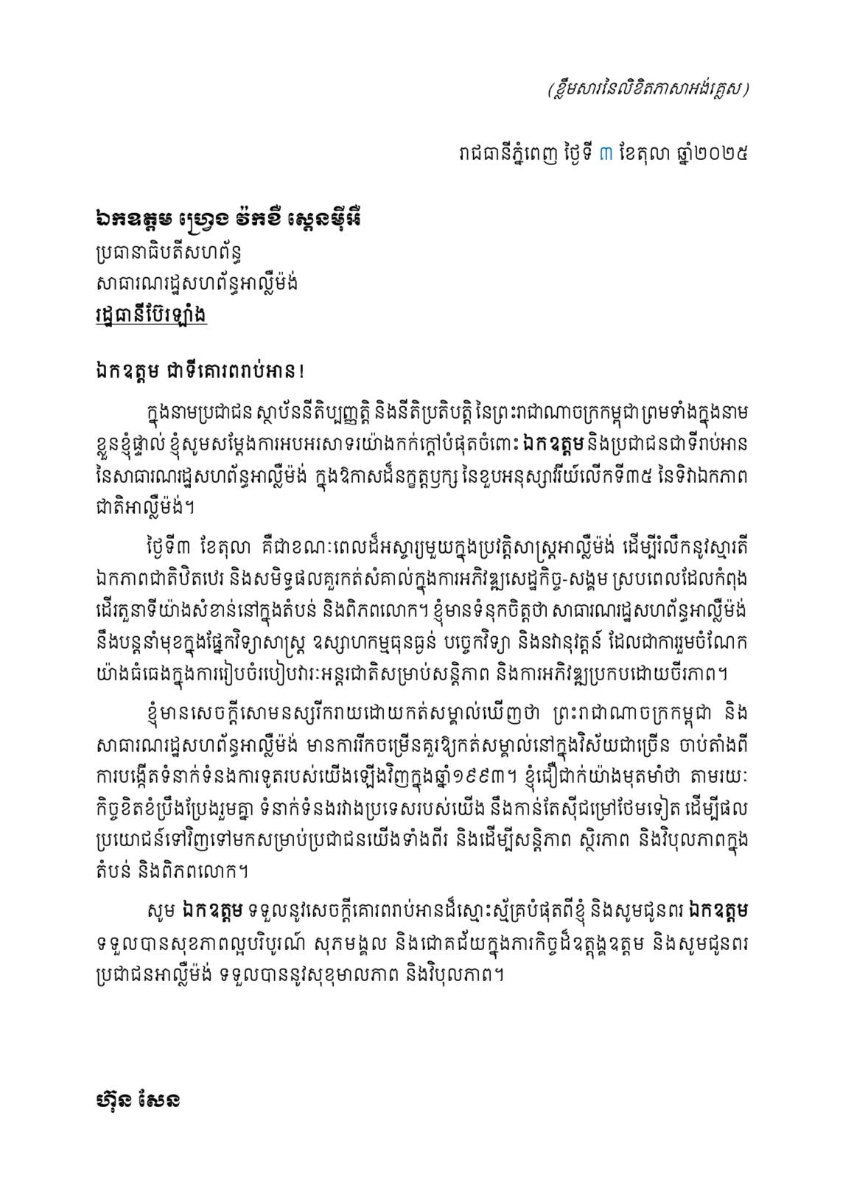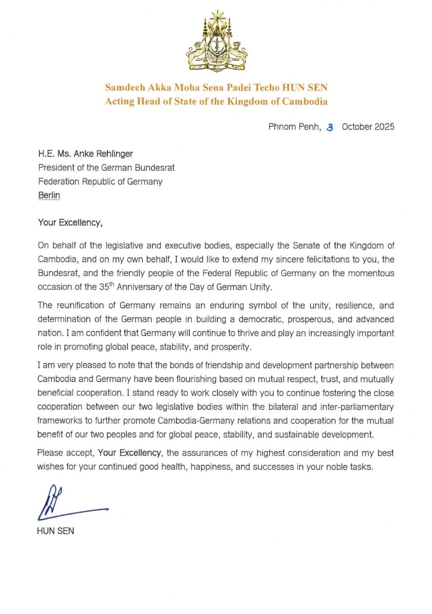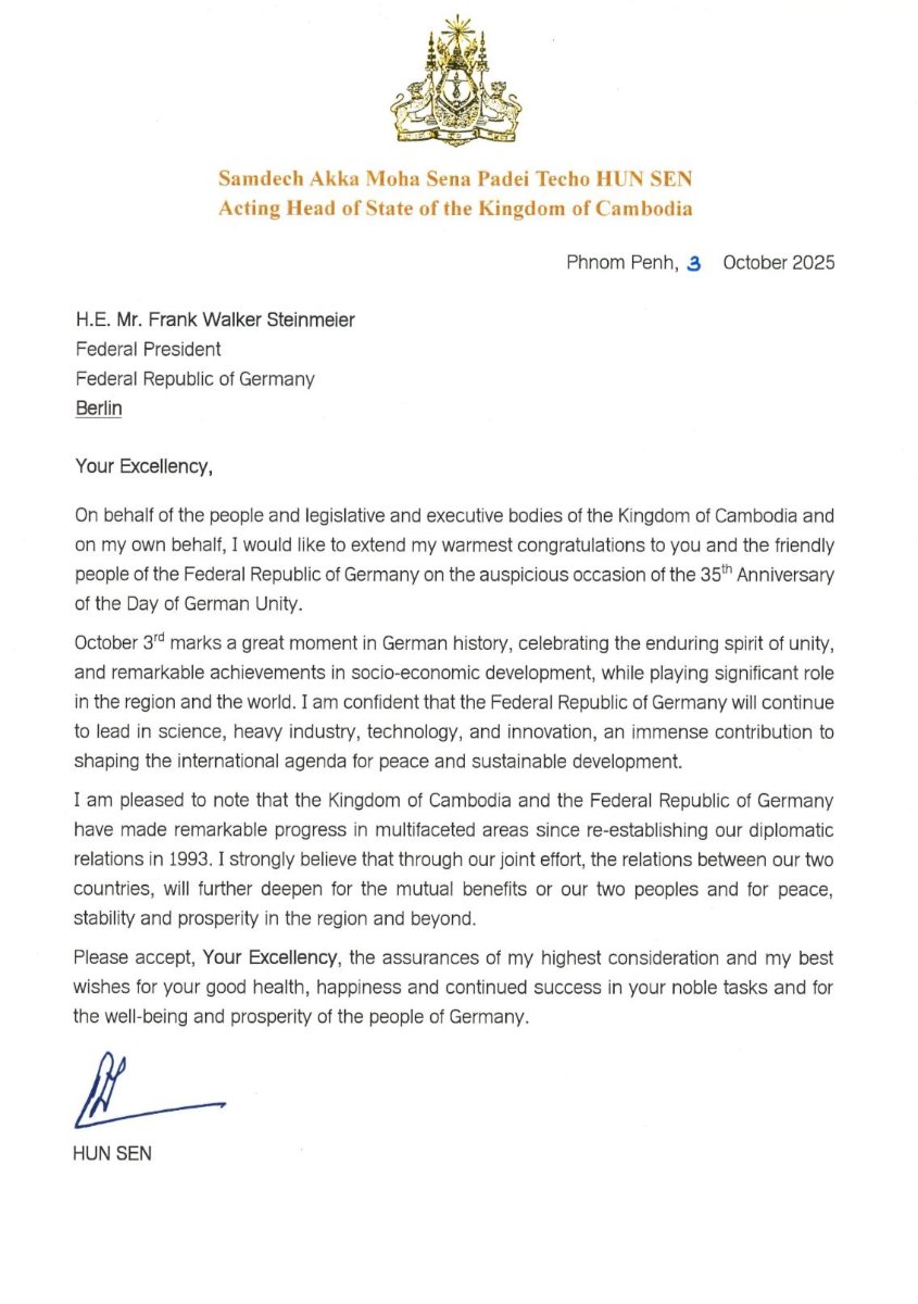 តាមរយៈសារលិខិត ផ្ញើរជូនប្រធានាធិបតីសហព័ន្ធអាល្លឺម៉ង់ ឯកឧត្តម ហ្វង វ៉កខឺ ស្តេនម៉ីអឺ និងលោកជំទាវអេនគេ រ៉េលីងហ្គឺ ប្រធានក្រុមប្រឹក្សាសហព័ន្ធសាធារណរដ្ឋសហព័ន្ធអាល្លឺម៉ង់ នៃខួបអនុស្សាវរីយ៍លើកទី៣៥ នៃទិវាឯកភាព ជាតិអាល្លឺម៉ង់ កាលពីថ្ងៃទី៣ ខែតុលា ឆ្នាំ២០២៥នេះ សម្តេចតេជោ ហ៊ុន សែន បានលើកឡើងថា ក្នុងនាមប្រជាជន ស្ថាប័ននីតិប្បញ្ញត្តិ និងនីតិប្រតិបត្តិ នៃព្រះរាជាណាចក្រកម្ពុជាព្រមទាំងក្នុងនាម សម្តេចផ្ទាល់ សម្តេចសូមសម្ដែងការអបអរសាទរយ៉ាងកក់ក្តៅបំផុតចំពោះ ឯកឧត្តមនិងប្រជាជនជាទីរាប់អាន នៃសាធារណរដ្ឋសហព័ន្ធអាល្លឺម៉ង់ ក្នុងឱកាសដ៏នក្ខត្តឫក្ស នៃខួបអនុស្សាវរីយ៍លើកទី៣៥ នៃទិវាឯកភាព ជាតិអាល្លឺម៉ង់។