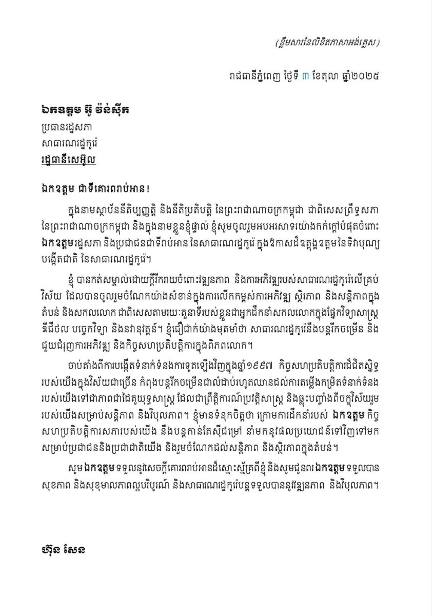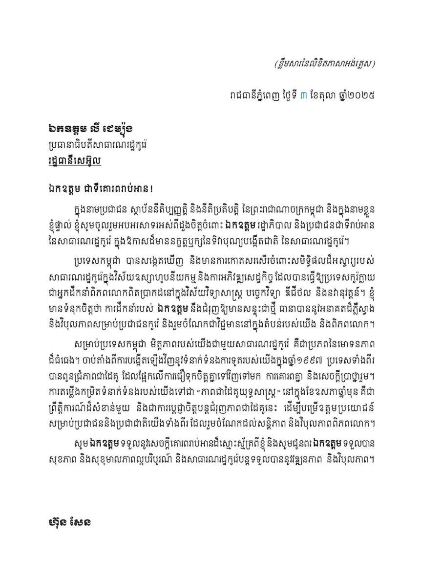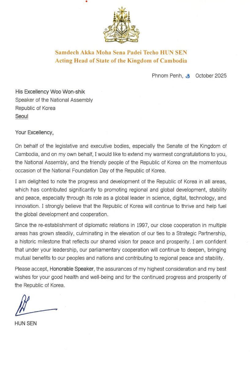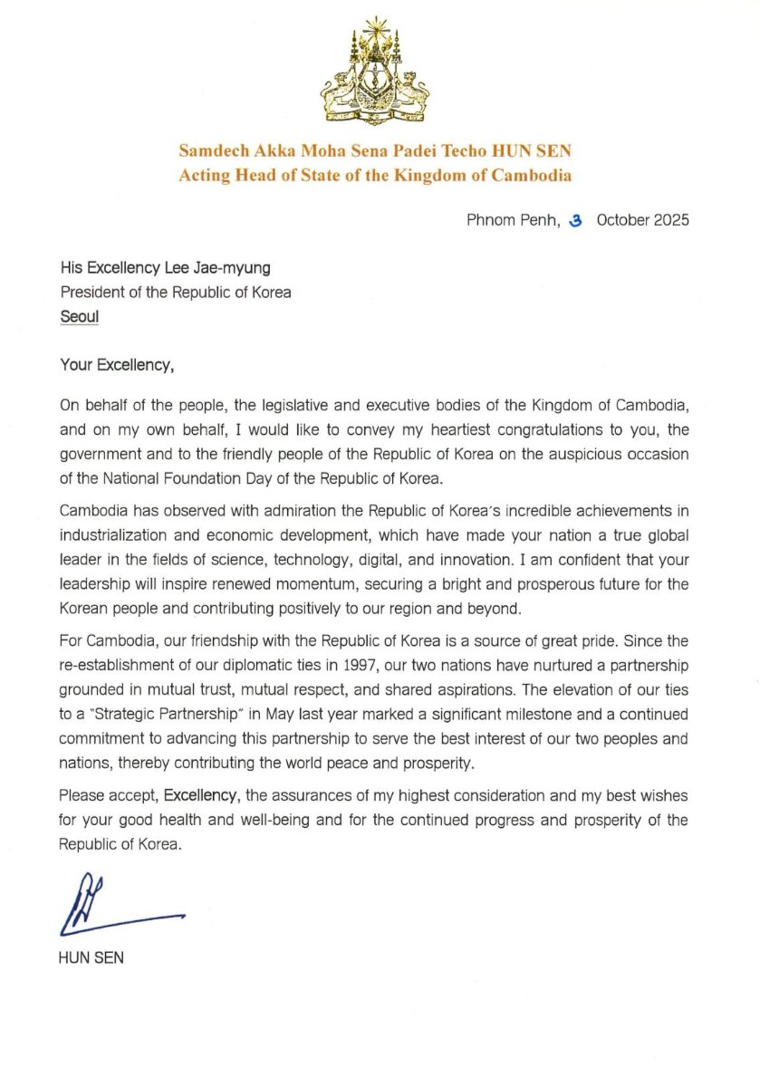 តាមរយៈសារលិខិតផ្ញើជូនដល់ឯកឧត្តម លី ជេម្យ៉ុង ប្រធានាធិបតីកូរ៉េ កាលពីថ្ងៃទី៣ ខែតុលា ឆ្នាំ ២០២៥ម្សិលមិញនេះ ក្នុងឱកាសទិវាបុណ្យបង្កើតជាតិ នៃសាធារណរដ្ឋកូរ៉េ សម្តេចតេជោ ហ៊ុន សែន បាន លើកឡើងថា ក្នុងនាមប្រជាជន ស្ថាប័ននីតិប្បញ្ញត្តិ និងនីតិប្រតិបត្តិ នៃព្រះរាជាណាចក្រកម្ពុជា និងក្នុងនាមសម្តេចផ្ទាល់ សម្តេចសូមចូលរួមអបអរសាទរអស់ពីដួងចិត្តចំពោះឯកឧត្តម ប្រធានាធិបតី រដ្ឋាភិបាល និងប្រជាជនជាទីរាប់អាននៃសាធារណរដ្ឋកូរ៉េ ក្នុងឱកាសដ៏មាននក្ខត្តឬក្សនៃទិវាបុណ្យបង្កើតជាតិ នៃសាធារណរដ្ឋកូរ៉េ។