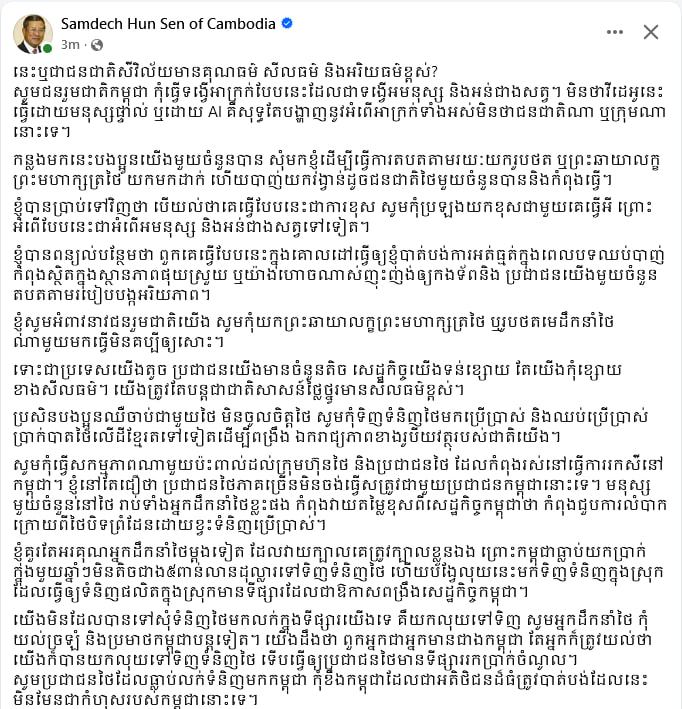 តាមរយៈបណ្ដាញសង្គមសម្ដេចតេជោ បានសរសេរថា «នេះឬជាជនជាតិស៊ីវិល័យមានគុណធម៌ សីលធម៌ និងអរិយធម៌ខ្ពស់? សូមជនរួមជាតិកម្ពុជា កុំធ្វើទង្វើអាក្រក់បែបនេះដែលជាទង្វើអមនុស្ស និងអន់ជាងសត្វ។ មិនថាវីដេអូនេះធ្វើដោយមនុស្សផ្ទាល់ ឬដោយ AI គឺសុទ្ធតែបង្ហាញនូវអំពើអាក្រក់ទាំងអស់មិនថាជនជាតិណា ឬក្រុមណានោះទេ។ »