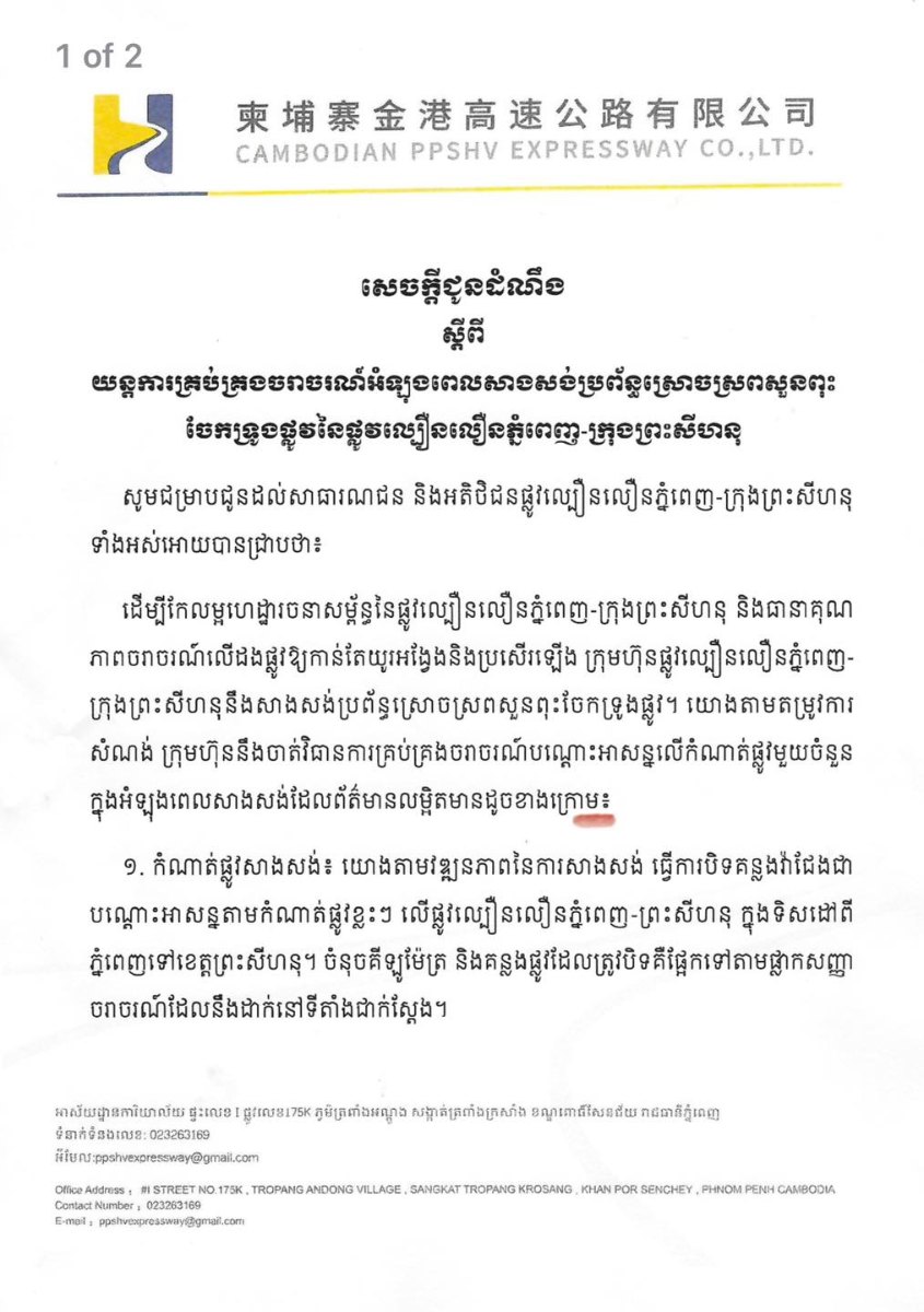 ១. កំណាត់ផ្លូវសាងសង់៖ យោងតាមវឌ្ឍនភាពនៃការសាងសង់ ធ្វើការបិទគន្លងរ៉ាជែងជា បណ្តោះអាសន្នតាមកំណាត់ផ្លូវខ្លះៗ លើផ្លូវល្បឿនលឿនភ្នំពេញ-ព្រះសីហនុ ក្នុងទិសដៅពី ភ្នំពេញទៅខេត្តព្រះសីហនុ។ ចំនុចគីឡូម៉ែត្រ និងគន្លងផ្លូវដែលត្រូវបិទគឺផ្អែកទៅតាមផ្លាកសញ្ញ ចរាចរណ៍ដែលនឹងដាក់នៅទីតាំងជាក់ស្ដែង។