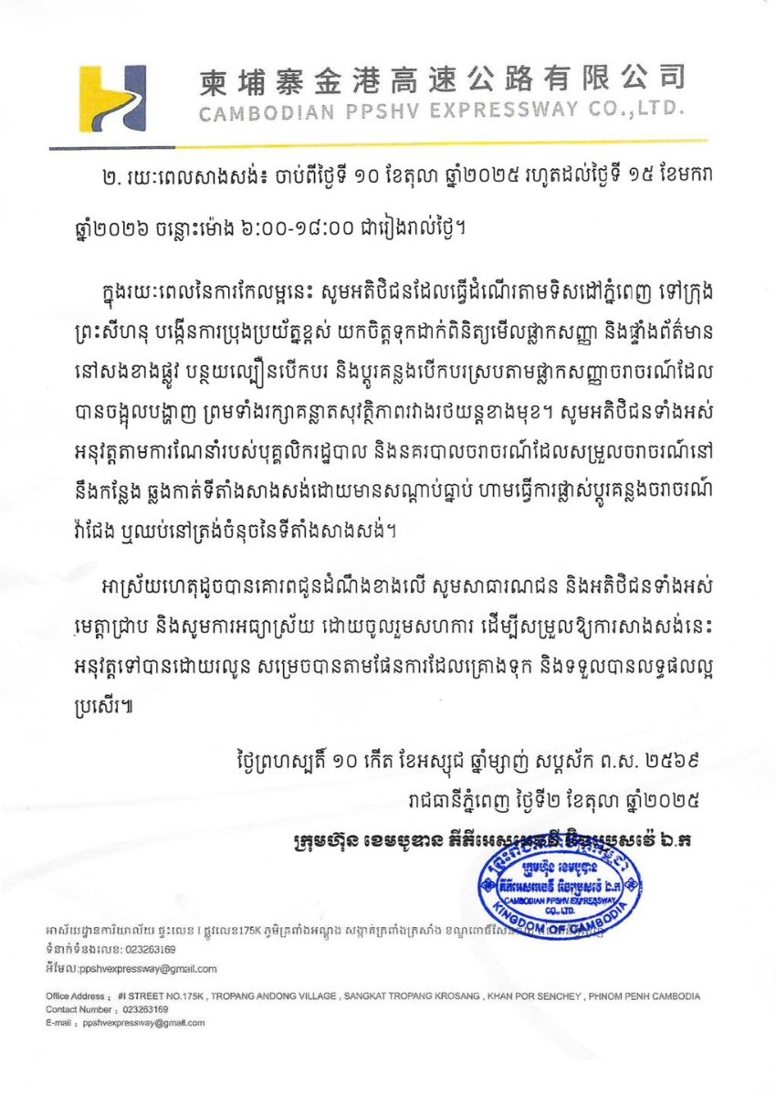 ២. រយៈពេលសាងសង់៖ ចាប់ពីថ្ងៃទី ១០ ខែតុលា ឆ្នាំ២០២៥ រហូតដល់ថ្ងៃទី ១៥ ខែមករា ឆ្នាំ២០២៦ ចន្លោះម៉ោង ៦:០០-១៨:០០ ជារៀងរាល់ថ្ងៃ។