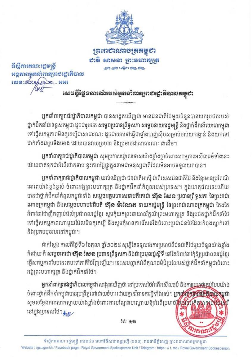អ្នកនាំពាក្យរាជរដ្ឋាភិបាលកម្ពុជា នៅថ្ងៃទី៧ ខែតុលា ឆ្នាំ២០២៥ នេះ បានចេញសេចក្ដីថ្លែងការណ៍ ប្រកាសថ្កោលទោសយ៉ាងខ្លាំងក្លាចំពោះសកម្មភាពអសីលធម៌របស់ជនជាតិថៃមួយចំនួន ដែលបានយករូបថតរបស់ថ្នាក់ដឹកនាំជាន់ខ្ពស់កម្ពុជា ទៅធ្វើសកម្មភាពមិនគួរគប្បីជាសាធារណៈ ដោយចាត់ទុកទង្វើនេះជាអំពើថោកទាប និងខ្វះភាពថ្លៃថ្នូរក្នុងនាមជាមនុស្សជាតិ ដែលមិនអាចទទួលយកបាន។