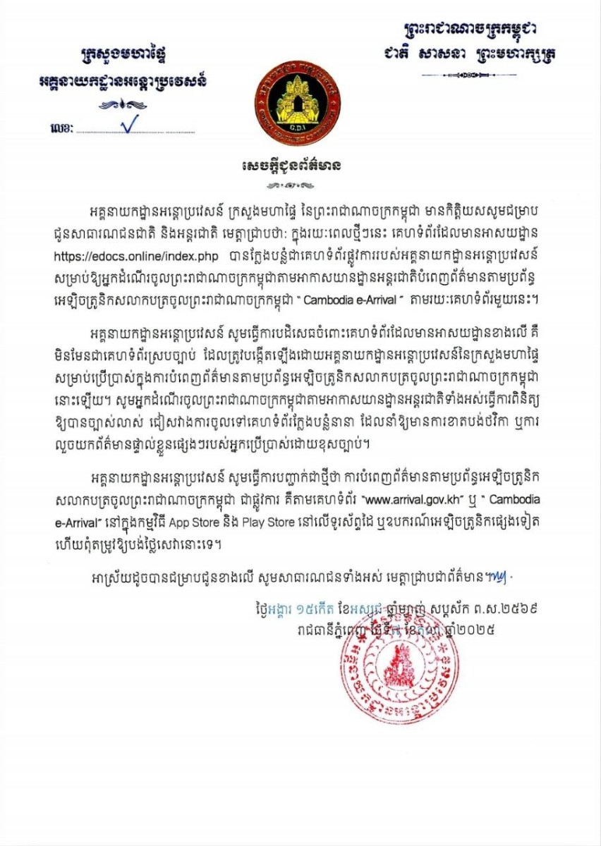 អគ្គនាយកដ្ឋានអន្តោប្រវេសន៍ ក្រសួងមហាផ្ទៃ នៃព្រះរាជាណាចក្រកម្ពុជា នៅថ្ងៃទី៧ ខែតុលា ឆ្នាំ២០២៥នេះ បានចេញ សេចក្ដីជូនព័ត៌មាន ជូនសាធារណជនជាតិ និងអន្តរជាតិ ឱ្យបានជ្រាបថា ក្នុងរយៈពេលថ្មីៗនេះ គេហទំព័រដែលមានអាសយដ្ឋាន https://edocs.online/index.php បានក្លែងបន្លំជាគេហទំព័រផ្លូវការរបស់អគ្គនាយកដ្ឋានអន្តោប្រវេសន៍សម្រាប់ឱ្យអ្នកដំណើរចូលព្រះរាជាណាចក្រកម្ពុជាតាមអាកាសយានដ្ឋានអន្តរជាតិបំពេញព័ត៌មានតាមប្រព័ន្ធ អេឡិចត្រូនិកសលាកបត្រចូលព្រះរាជាណាចក្រកម្ពុជា ” Cambodia e-Arrival ” តាមរយៈគេហទំព័រមួយនេះ។