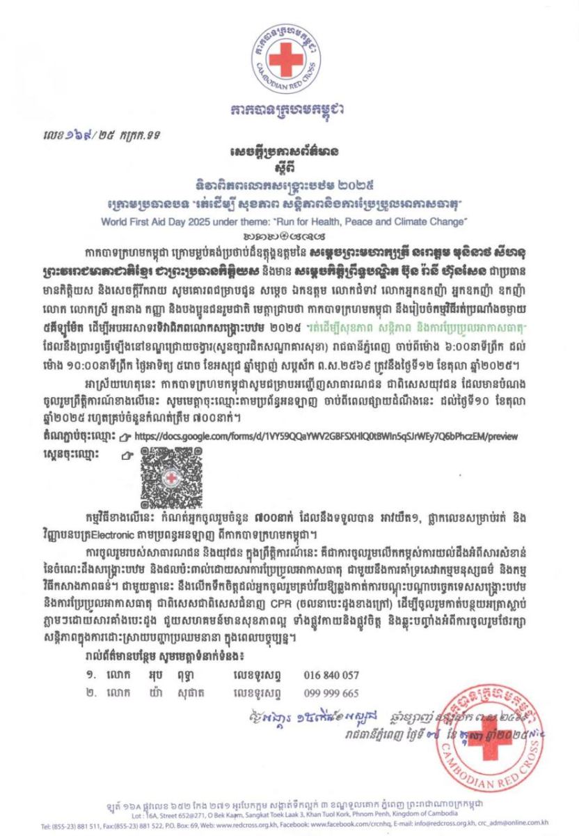 កាកបាទក្រហមកម្ពុជា នឹងរៀបចំកម្មវិធីរត់ប្រណាំងចម្ងាយ ៥គីឡូម៉ែត្រ ដើម្បីអបអរសាទរទិវាពិភពលោកសង្គ្រោះបឋម ២០២៥ ក្រោមប្រធានបទ «រត់ដើម្បីសុខភាព សន្តិភាព និងការប្រែប្រួលអាកាសធាតុ» ដែលនឹងប្រារព្ធធ្វើឡើងនៅខណ្ឌជ្រោយចង្វារ(សួនច្បារជិតសណ្ឋាគារសុខា) រាជធានីភ្នំពេញ ចាប់ពីម៉ោង ៦:០០នាទីព្រឹក ដល់ ម៉ោង ១០:០០នាទីព្រឹក ថ្ងៃអាទិត្យ ទី១២ ខែតុលា ឆ្នាំ២០២៥។