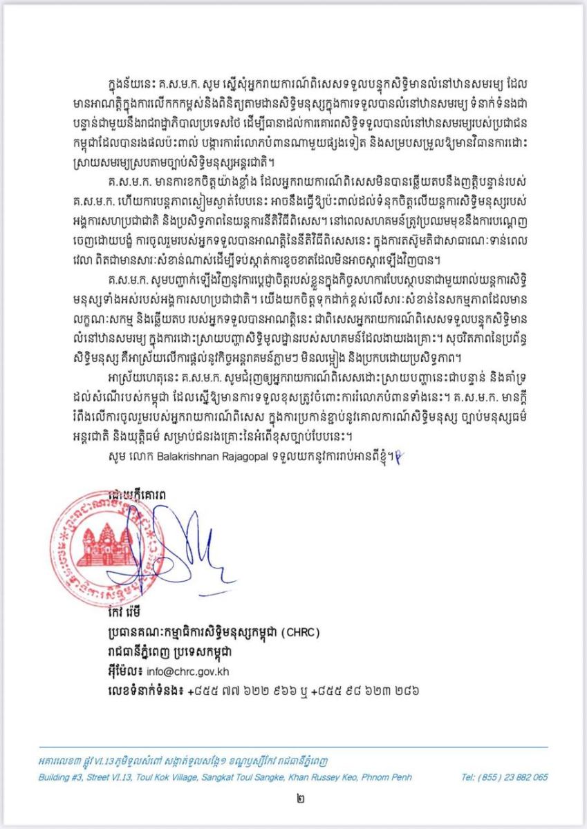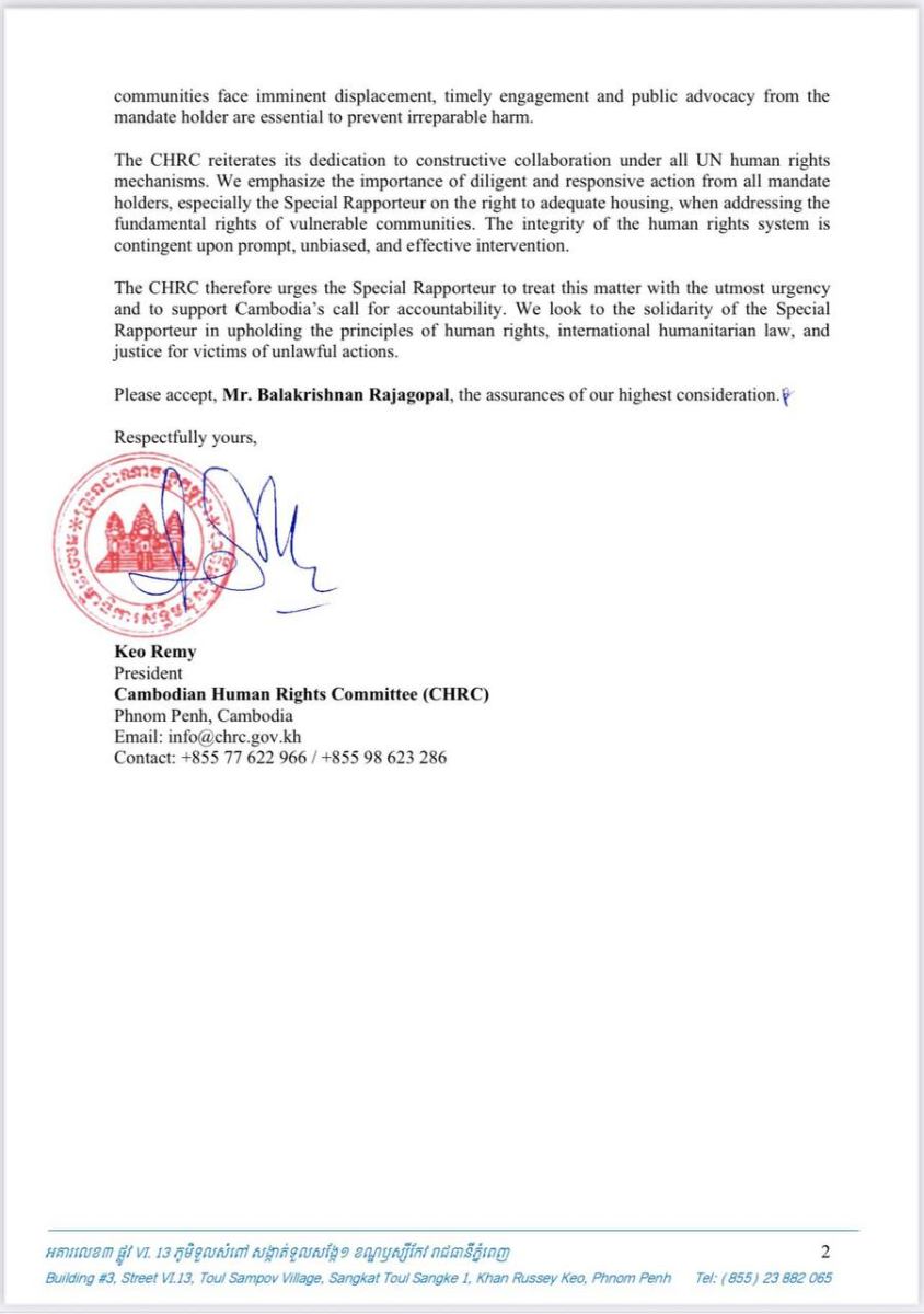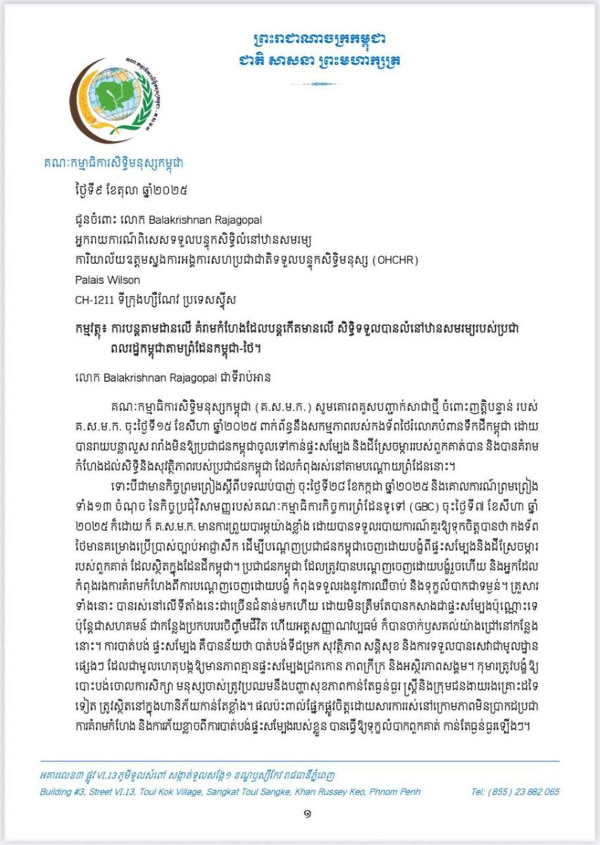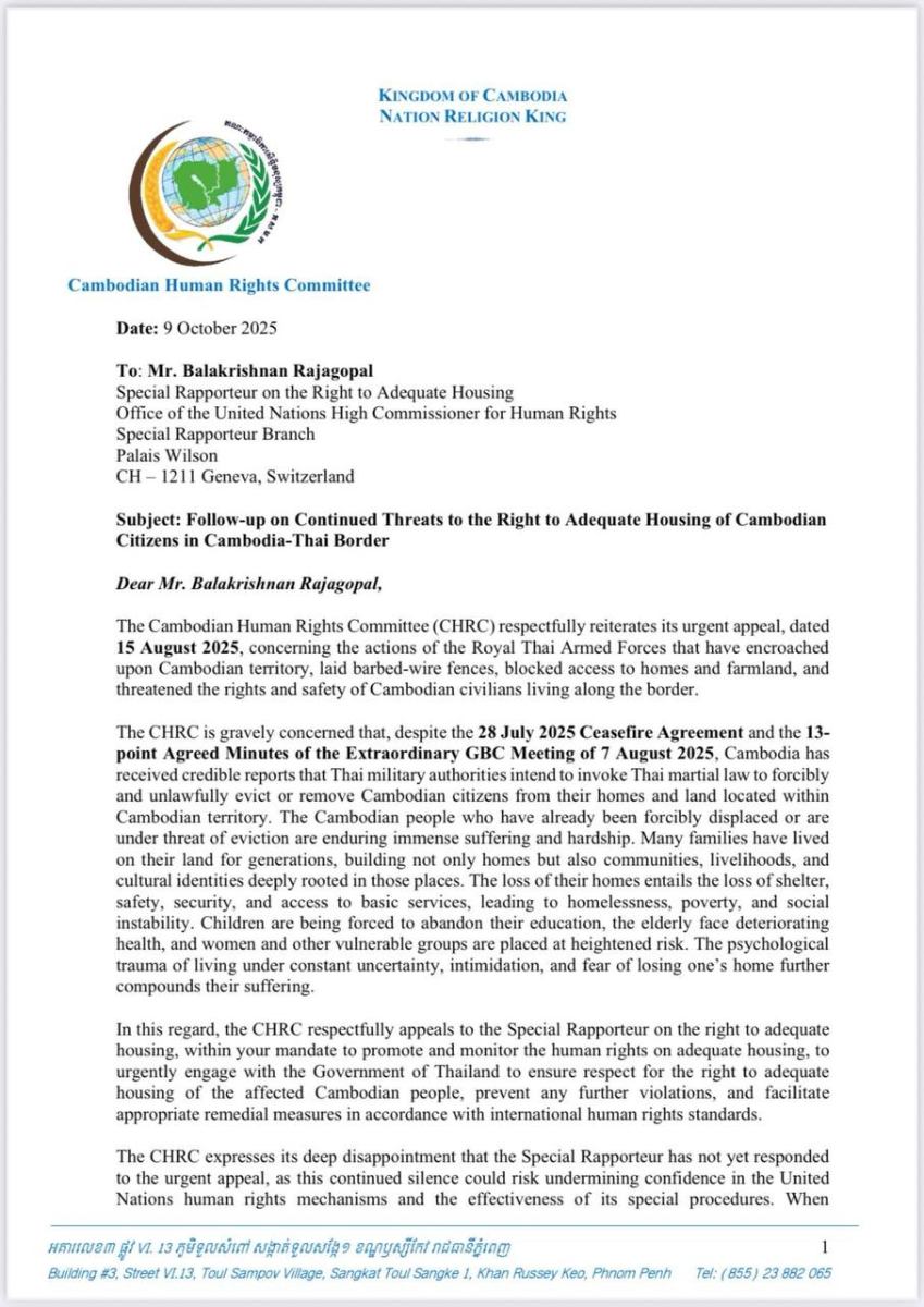 តាមរយៈលិខិតរបស់ឯកឧត្តម កែវ រ៉េមី ប្រធានគណៈកម្មាធិការសិទ្ធិមនុស្សកម្ពុជា ជាលើកទីពីរផ្ញើទៅកាន់លោក Balakrishnan Rajagopal អ្នករាយការណ៍ពិសេសទទួលបន្ទុកសិទ្ធិលំនៅឋានសមរម្យ នៃការិយាល័យឧត្តមស្នងការអង្គការសហប្រជាជាតិ ទទួលបន្ទុកសិទ្ធិមនុស្ស (OHCHR) នាថ្ងៃទី៩ ខែតុលា ឆ្នាំ២០២៥នេះបានលើកឡើងថា គ.ស.ម.ក.មានការព្រួយបារម្ភយ៉ាងខ្លាំងដោយបានទទួលរបាយការណ៍គួរឱ្យទុកចិត្តបានថា កងទ័ពថៃមានគម្រោងប្រើប្រាស់ច្បាប់អាជ្ញាសឹក ដើម្បីបណ្ដេញប្រជាជនកម្ពុជាចេញដោយបង្ខំពីផ្ទះសម្បែងនិងដីស្រែចម្ការ របស់ពួកគាត់ ដែលស្ថិតក្នុងដែនដីកម្ពុជា។