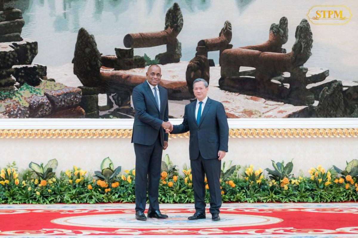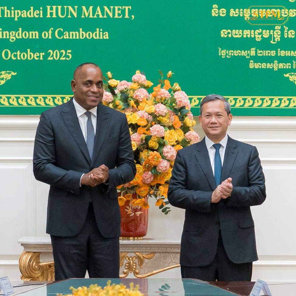 នាព្រឹកថ្ងៃទី៩ ខែតុលា ឆ្នាំ២០២៥ នៅវិមានសន្តិភាព សម្តេចមហាបវរធិបតី ហ៊ុន ម៉ាណែត នាយករដ្ឋមន្ត្រីនៃព្រះរាជាណាចក្រកម្ពុជា បានជួបពិភាក្សាការងារទ្វេភាគីជាមួយឯកឧត្តម រ៉ូសឺវែល ស្កឺរីត (Roosevelt Skerrit) នាយករដ្ឋមន្ត្រីនៃកុំមិនវែលដូមីនីក និងគណៈប្រតិភូជាន់ខ្ពស់ ក្នុងឱកាសនៃដំណើរទស្សនកិច្ចការងារនៅព្រះរាជាណាចក្រកម្ពុជា។