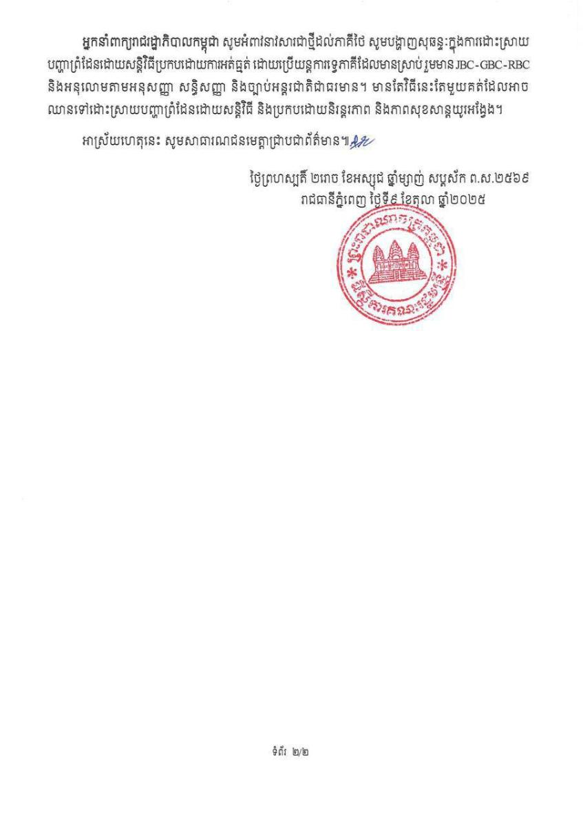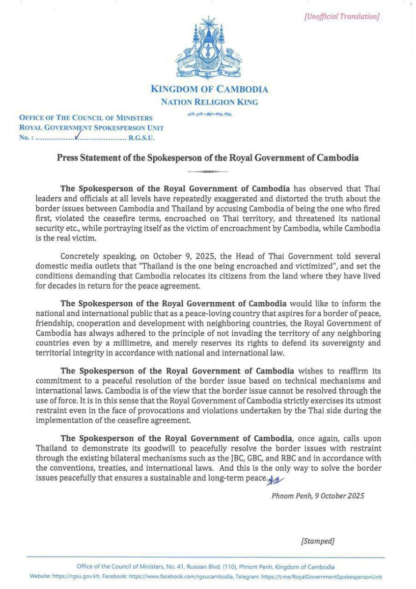 ឯកឧត្ដម ប៉ែន បូណា រដ្ឋមន្ត្រីប្រតិភូអមនាយករដ្ឋមន្ត្រី និងជាប្រធានអង្គភាពអ្នកនាំពាក្យរាជរដ្ឋាភិបាល នៅរាត្រីថ្ងៃទី៩ ខែតុលា ឆ្នាំ២០២៥ បានបញ្ជាក់ជូនសារជាថ្មីថា រាជរដ្ឋាភិបាលកម្ពុជានៅតែរក្សាជំហរដោះស្រាយបញ្ហាព្រំដែនដោយសន្តិវិធី ដោយឈរលើយន្តការបច្ចេកទេស និងច្បាប់អន្តរជាតិ ហើយចាត់ទុកថា ការប្រើប្រាស់កម្លាំងយោធាមិនអាចដោះស្រាយបញ្ហាព្រំដែនបានឡើយ។