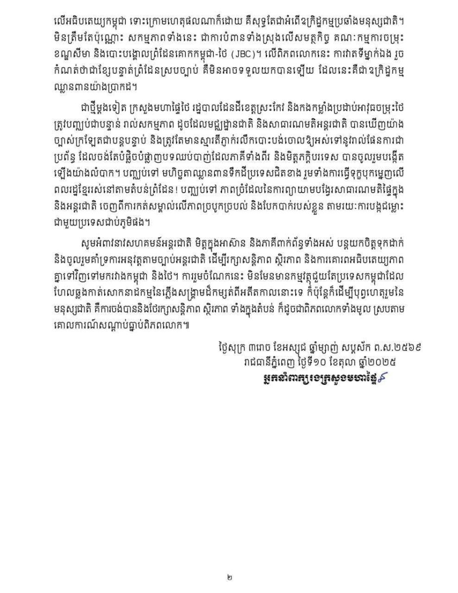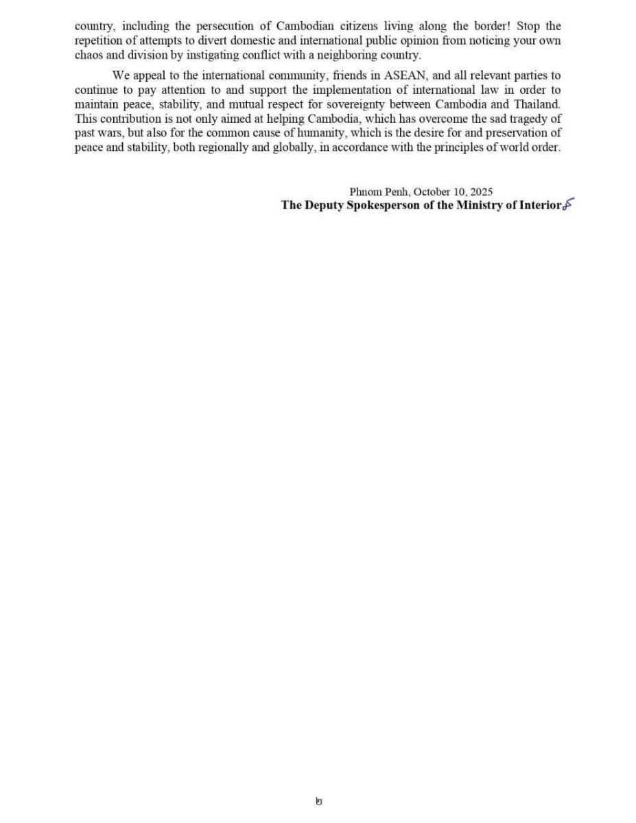 យ៉ាងណាក៏ដោយក្រសួងមហាផ្ទៃកម្ពុជា បានបន្តអំពាវនាវសហគមន៍អន្តរជាតិ មិត្តក្នុងអាស៊ាន និងភាគីពាក់ព័ន្ធទាំងអស់បន្តយកចិត្តទុកដាក់ និងចូលរួមគាំទ្រការអនុវត្តតាមច្បាប់អន្តរជាតិ ដើម្បីរក្សាសន្តិភាព ស្ថិរភាព និងការគោរពអធិបតេយ្យភាព គា្នទៅវិញទៅមករវាងកម្ពុជា និងថៃ។ ការរួមចំណែកនេះ មិនមែនមានកម្មវត្ថុជួយតែប្រទេសកម្ពុជា ដែលហែលឆ្លងកាត់សោកនាដកម្មនៃភ្លើងសង្គ្រាមដ៏កម្សត់ពីអតីតកាលនោះទេ ក៏ប៉ុន្តែក៏ដើម្បីបុព្វហេតុរួមនៃ មនុស្សជាតិ គឺការចង់បាននិងថែរក្សាសន្តិភាព ស្ថិរភាព ទាំងក្នុងតំបន់ ក៏ដូចជាពិភពលោកទាំងមូល ស្របតាម គោលការណ៍សណ្ដាប់ធ្នាប់ពិភពលោកផងដែរ៕អត្ថបទ បានចក់