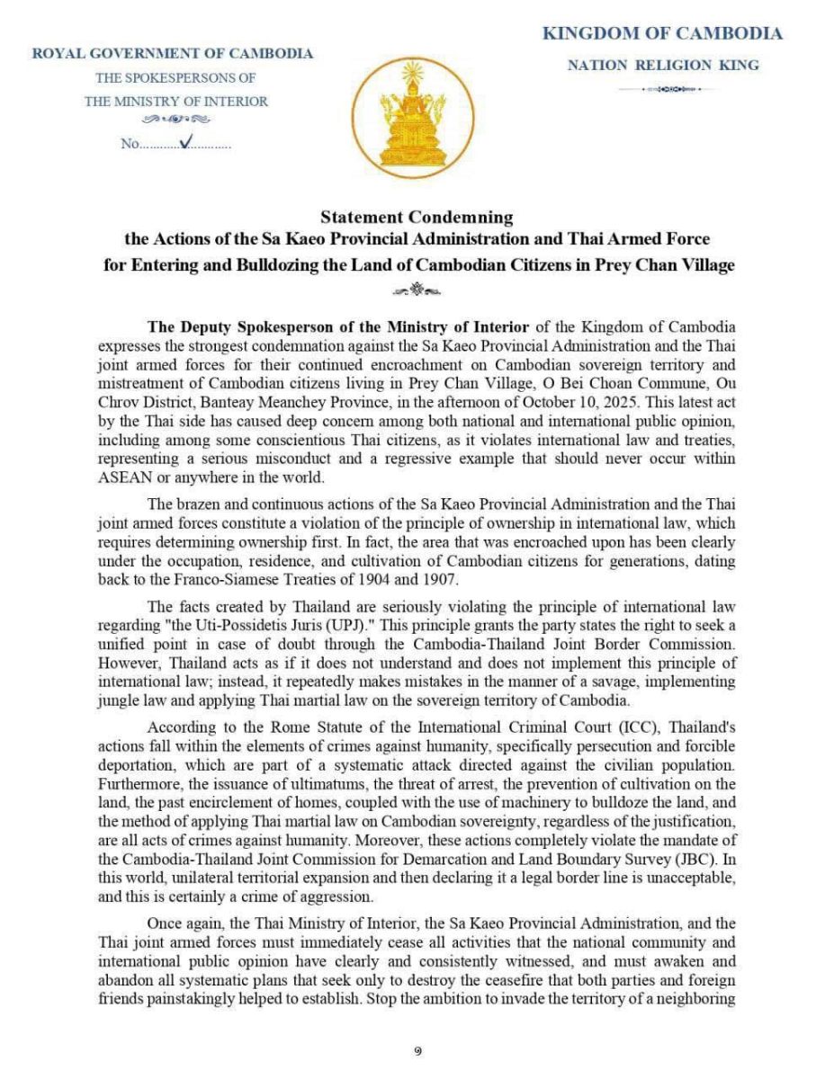 យោងតាមសេចក្តីថ្លែងការណ៍ថ្កោលទោស សកម្មភាពរដ្ឋបាលដែនដីខេត្តស្រះកែវ និងកងកម្លាំង ប្រដាប់អាវុធថៃ ចូលឈូសឆាយដីធ្លីពលរដ្ឋខ្មែរ នៅភូមិព្រៃចាន់ នាថ្ងៃទី១០ ខែតុលា ឆ្នាំ២០២៥នេះ បាន លើកឡើងថា ទង្វើគឃ្លីនជាបន្តបន្ទាប់ឥតអៀនខ្មាសពីរដ្ឋបាលដែនដីខេត្តស្រះកែវ និងកងកម្លាំងប្រដាប់អាវុធចម្រុះថៃ ជាការរំលោភគោលការណ៍កម្មសិទ្ធិក្នុងនីតិអន្តរជាតិ ខណៈទីតាំងដែលអាជ្ញាធរថៃធ្វើការ រំលោភបំពាននេះ គឺស្ថិតក្រោមការកាន់កាប់រស់នៅអាស្រ័យផល នៃពលរដ្ឋកម្ពុជាស្រស់ៗ តៗជំនាន់ តាំងពីកកើតសន្ធិសញ្ញាបារាំង-សៀម ឆ្នាំ១៩០៤ និង ១៩០៧មកម្ល៉េះ។