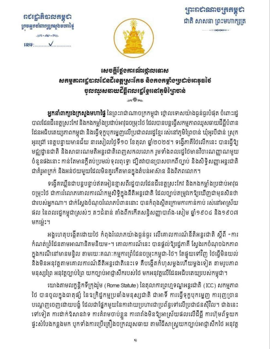 ជាមួយគ្នានោះដែរ ក្រសួងមហាផ្ទៃកម្ពុជា ក៏បានប្រាប់ទៅក្រសួងមហាផ្ទៃថៃ រដ្ឋបាលដែនដីខេត្តស្រះកែវ ក៏ដូចជាកងកម្លាំងប្រដាប់អាវុធចម្រុះថៃ ត្រូវបញ្ឈប់ជាបន្ទាន់ រាល់សកម្មភាព ដូចដែលមជ្ឈដ្ឋានជាតិ និងសាធារណមតិអន្តរជាតិ បានឃើញយ៉ាងច្បាស់ក្រឡែតជាបន្តបន្ទាប់ និងត្រូវតែមានស្មារតីភ្ញាក់រលឹកបោះបង់ចោលឱ្យអស់ទៅនូវរាល់ផែនការជាប្រព័ន្ធ ដែលចង់តែបំផ្លិចបំផ្លាញបទឈប់បាញ់ដែលភាគីទាំងពីរ និងមិត្តភក្តិបរទេសបានចូលរួមបង្កើត ឡើងយ៉ាងលំបាកនោះ។