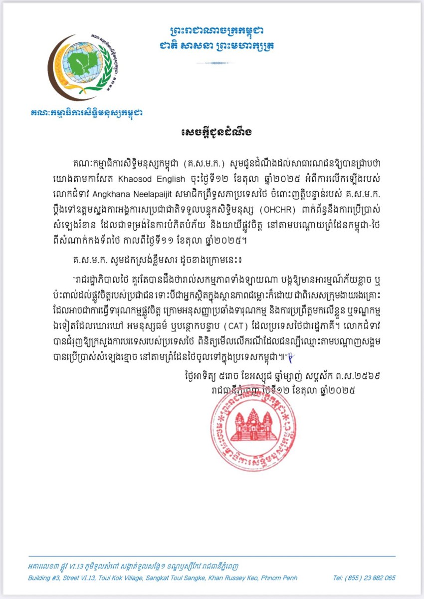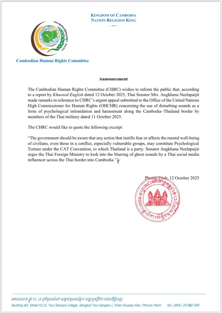តាមសេចក្ដីជូនដំណឹងរបស់ គណៈកម្មាធិការសិទ្ធិមនុស្សកម្ពុជា (គ.ស.ម.ក.) យោងតាមកាសែត Khaosod English ចុះថ្ងៃទី១២ ខែតុលា ឆ្នាំ២០២៥ អំពីការលើកឡើងរបស់ លោកជំទាវ Angkhana Neelapaijit សមាជិកព្រឹទ្ធសភាប្រទេសថៃ ចំពោះញត្តិបន្ទាន់របស់ គ.ស.ម.ក. ប្តឹងទៅឧត្តមស្នងការអង្គការសប្រជាជាតិទទួលបន្ទុកសិទ្ធិមនុស្ស (OHCHR) ពាក់ព័ន្ធនឹងការប្រើប្រាស់ សំឡេងរំខាន ដែលជាទម្រង់នៃការបំភិតបំភ័យ និងយាយីផ្លូវចិត្ត នៅតាមបណ្តោយព្រំដែនកម្ពុជា-ថៃ ពីសំណាក់កងទ័ពថៃ កាលពីថ្ងៃទី១១ ខែតុលា ឆ្នាំ២០២៥។