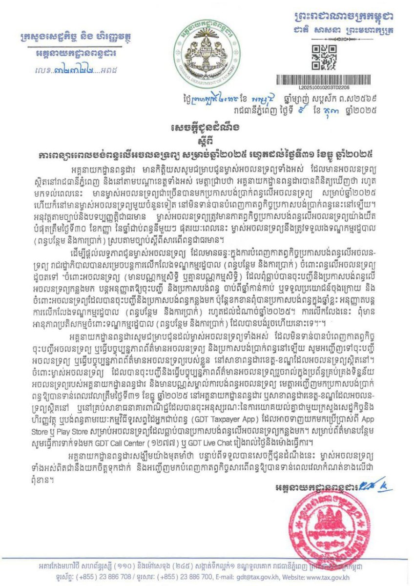 អគ្គនាយកដ្ឋានពន្ធដារ ចេញសេចក្តីជូនដំណឹង ស្តីពីការពន្យារពេលបង់ពន្ធលើអចលនទ្រព្យសម្រាប់ឆ្នាំ២០២៥ រហូតដល់ ថ្ងៃទី៣១ ខែធ្នូ ឆ្នាំ២០២៥, ដែលបញ្ហានេះអគ្គនាយកដ្ឋានពន្ធដារបានពិនិត្យឃើញថា រហូតមកទល់ពេលនេះ មានម្ចាស់អចលនទ្រព្យ ជាច្រើន បានមកប្រកាសបង់ប្រាក់ពន្ធលើអចលនទ្រព្យសម្រាប់ឆ្នាំ២០២៥ ហើយក៏នៅមានម្ចាស់អចលនទ្រព្យមួយចំនួនទៀត នៅមិន ទាន់បានបំពេញកាតព្វកិច្ចប្រកាសបង់ប្រាក់ពន្ធនេះនៅឡើយ។ អនុវត្តតាមច្បាប់ និងបទប្បញ្ញត្តិជាធរមាន ម្ចាស់អចលនទ្រព្យត្រូវមាន កាតព្វកិច្ចប្រកាសបង់ពន្ធលើអចលនទ្រព្យយ៉ាងយឺតបំផុត ត្រឹមថ្ងៃទី៣០ ខែកញ្ញា នៃឆ្នាំជាប់ពន្ធនីមួយៗ។ ផុតរយៈពេលនេះ ម្ចាស់ អចលនទ្រព្ នឹងត្រូវទទួលរងទណ្ឌកម្មរដ្ឋបាល (ពន្ធបន្ថែម និងការប្រាក់) ស្របតាមច្បាប់ស្តីពីសារពើពន្ធជាធរមាន។