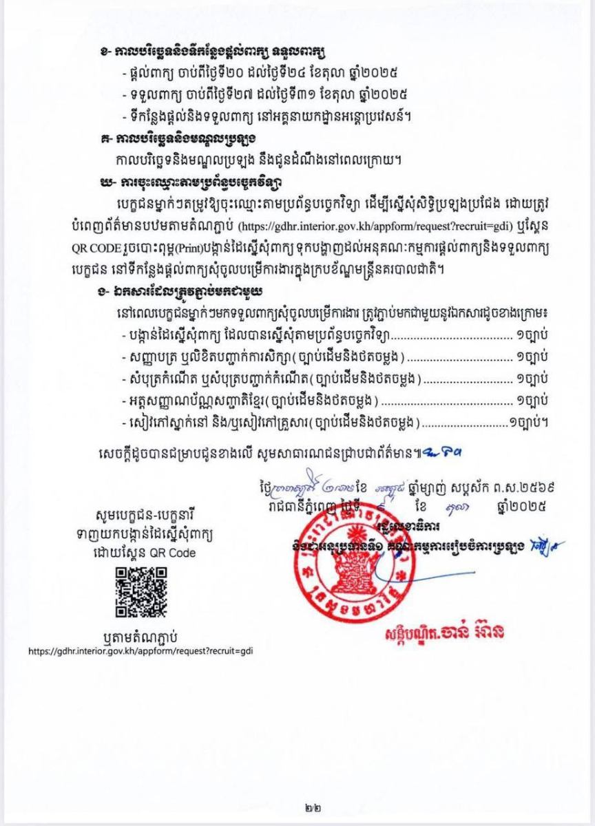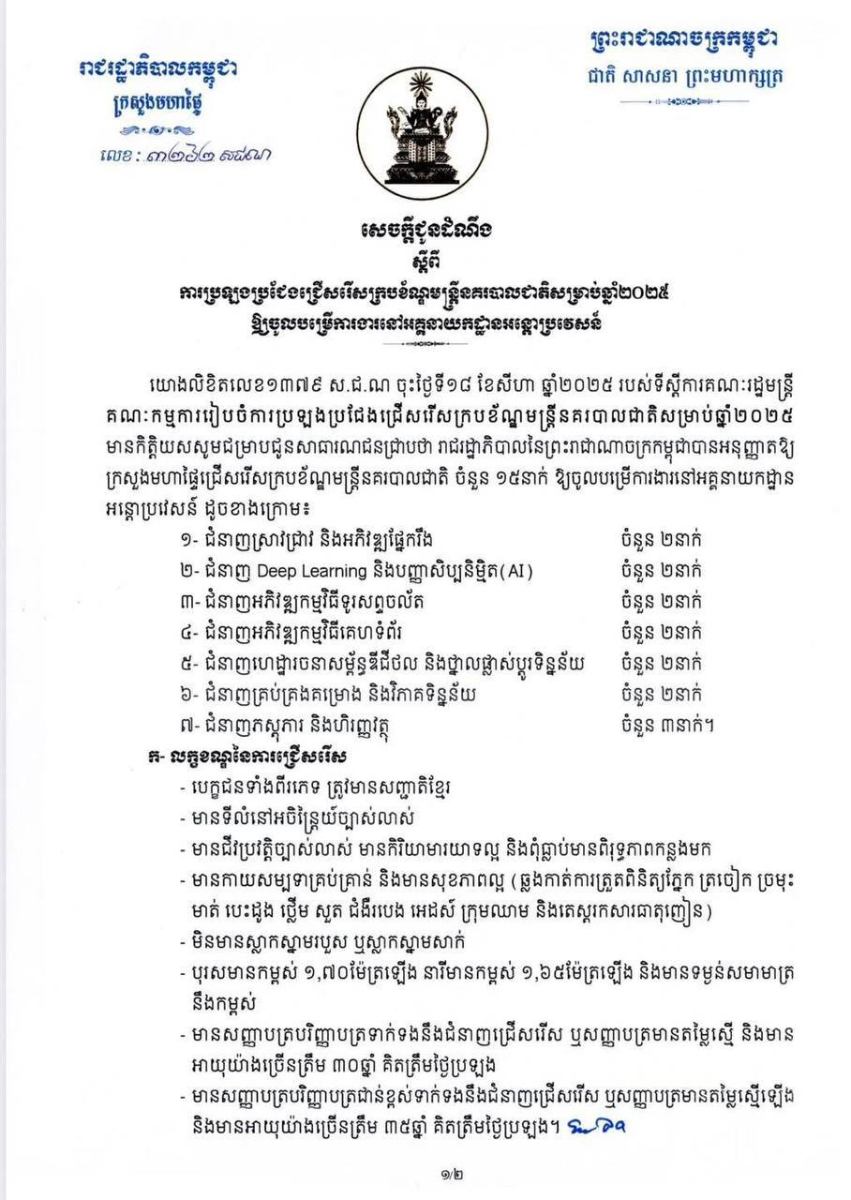 យោងលិខិតលេខ១៣៧៩ ស.ជ.ណ ចុះថ្ងៃទី១៨ ខែសីហា ឆ្នាំ២០២៥ របស់ ទីស្តីការគណៈរដ្ឋមន្តី គណៈកម្មការរៀបចំការប្រឡងប្រជែងជ្រើសរើក្របខ័ណ្ឌមន្ត្រីនគរបាលជាតិ សម្រាប់ឆ្នាំ២០២៥ បានជម្រាបជូនសាធារណជនជ្រាបថា រាជរដ្ឋាភិបាល ព្រះរាជាណាចក្រកម្ពុជាបានអនុញ្ញាតឱ្យ ក្រសួងមហាផ្ទៃជ្រើសរើសក្របខ័ណ្ឌមន្ត្រីនគរបាលជាតិ ចំនួន ១៥នាក់ ឱ្យចូលបម្រើការងារនៅអគ្គនាយកដ្ឋានអន្តោប្រវេសន៍ ដូចខាងក្រោម៖