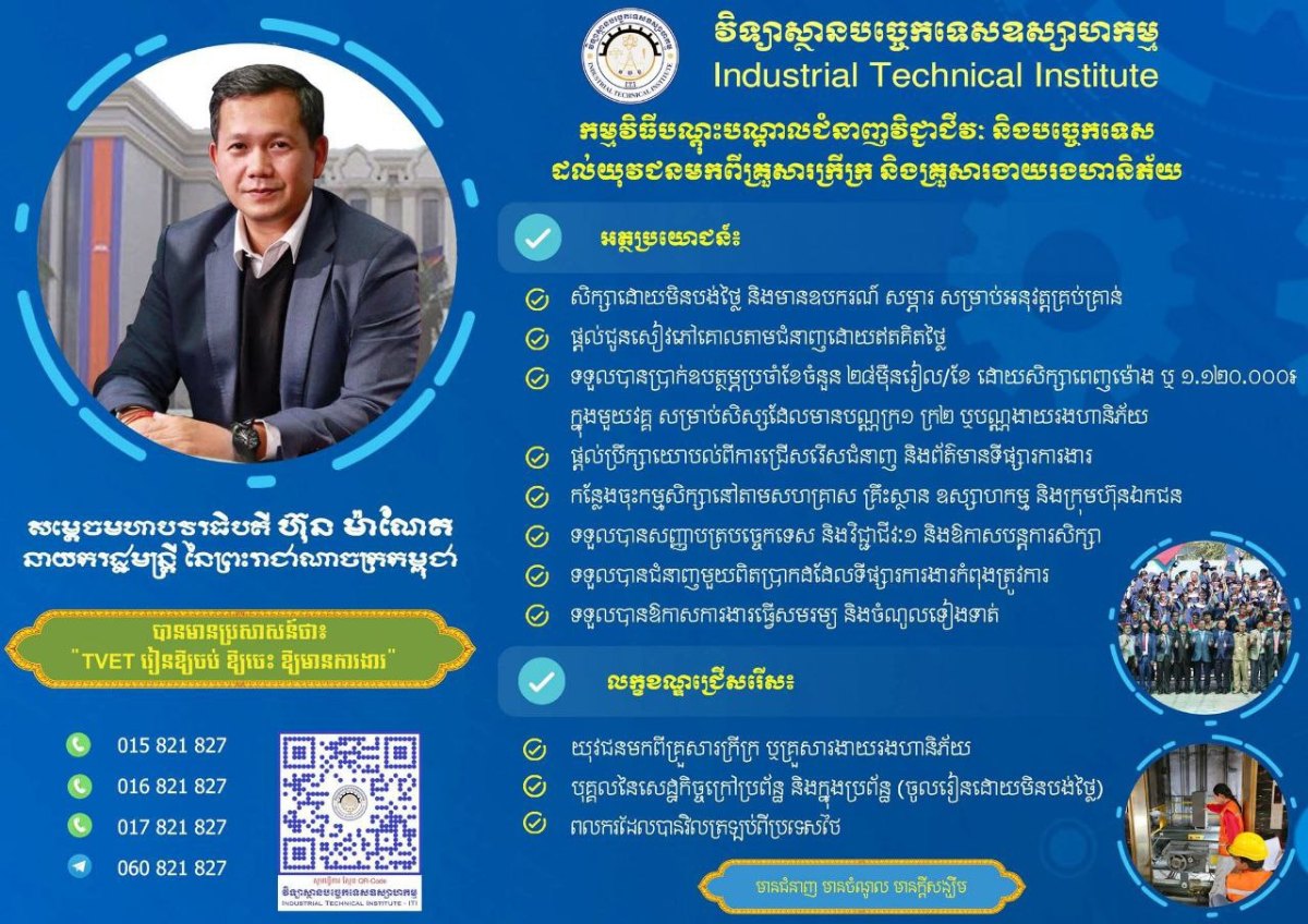 វិទ្យាស្ថានបច្ចេកទេសឧស្សាហកម្ម នៃក្រសួងការងារ និងបណ្តុះបណ្តាលវិជ្ជាជីវៈ ផ្តល់អាហារូបករណ៍ចំនួន ១ ១៦០កន្លែង លើ ១៦មុខជំនាញ ដល់យុវជនមកពីគ្រួសារក្រីក្រ និងគ្រួសារងាយរងហានិភ័យ ព្រមទាំងផ្ដល់ប្រាក់ឧបត្ថម្ភប្រចាំខែ ក្រោមកម្មវិធីបណ្តុះបណ្តាលជំនាញវិជ្ជាជីវៈ និងបច្ចេកទេសដល់យុវជនមកពីគ្រួសារក្រីក្រ និងគ្រួសារងាយរងហានិភ័យ (TVET 1.5M)។ សម្រាប់ប្រជាពលរដ្ឋ និងយុវជន ដែលមិនមែនជាក្រុមគោលដៅ ក៏អាចស្នើចុះឈ្មោះចូលសិក្សាបានដោយឥតគិតថ្លៃផងដែរ ប៉ុន្តែមិនទទួលបានប្រាក់ឧបត្ថម្ភនោះឡើយ។