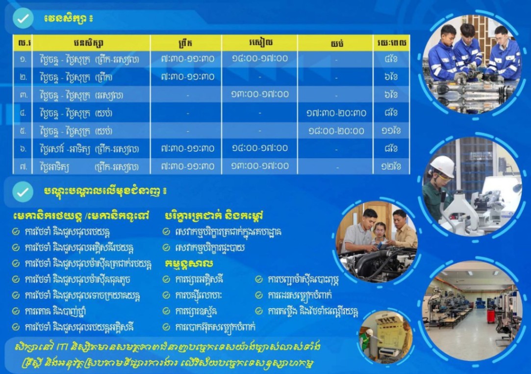 មុខជំនាញទាំង១៦ នោះ រួមមាន ការថែទាំ និងជួសជុលរថយន្ត, ការថែទាំ និងជួសជុលអគ្គិសនីរថយន្ត, ការថែទាំ និងជួសជុលម៉ាស៊ីនត្រជាក់រថយន្ត, ការថែទាំ និងជួសជុលម៉ាស៊ីនធុនតូច, ការថែទាំ និងជួសជុលទោចក្រយានយន្ត, ការតោន និងបាញ់ថ្នាំ, ការថែទាំ និងជួសជុលរថយន្តអគ្គិសនី, សេវាកម្មបរិក្ខារត្រជាក់ក្នុងគេហដ្ឋាន, សេវាកម្មបរិក្ខារផ្ទះបាយ, ការផ្សារអគ្គិសនី, ការបន្ស៊ីលោហៈ, ការផ្សារឧស្ម័ន, ការបោកអ៊ុតសម្លៀកបំពាក់, ការបញ្ជាម៉ាស៊ីនបោះពុម្ព , ការដេរសម្លៀកបំពាក់ និងការដំឡើង និងថែទាំជណ្តើរយន្ត។