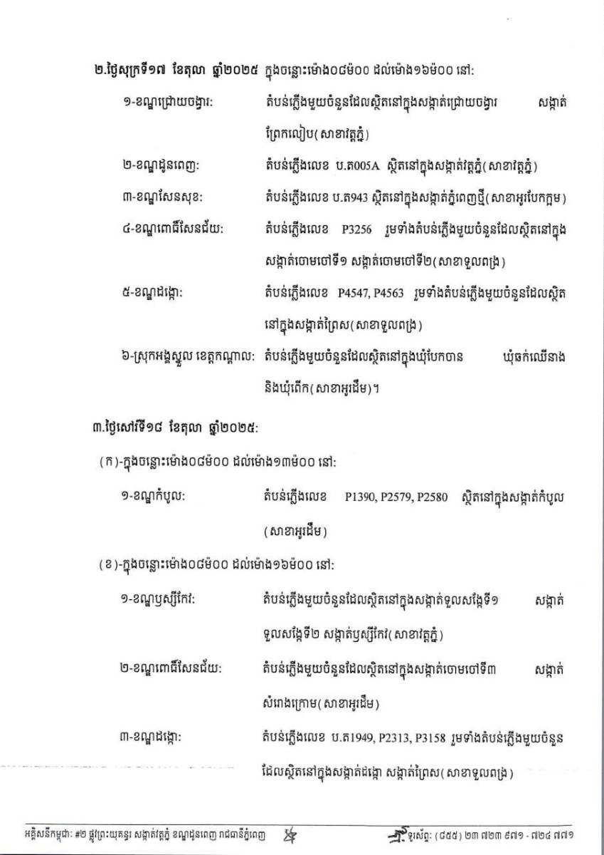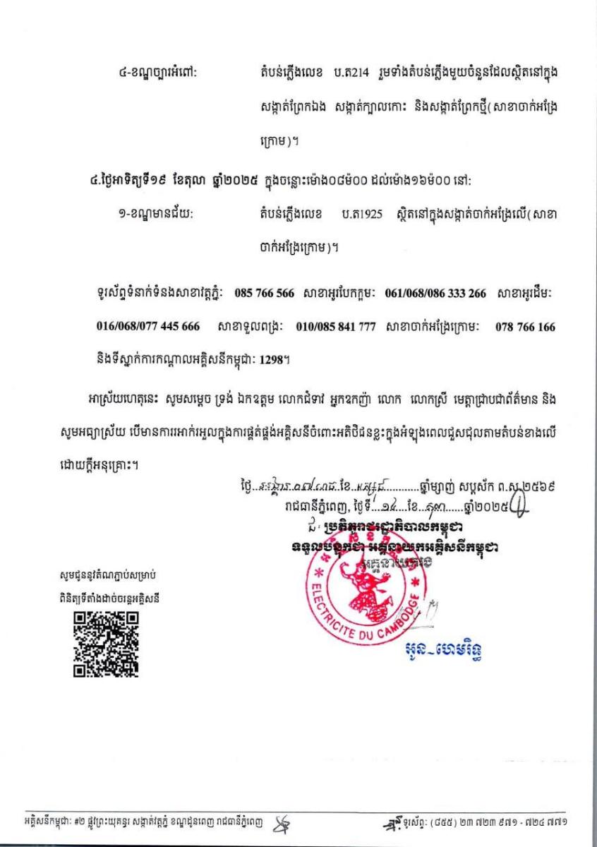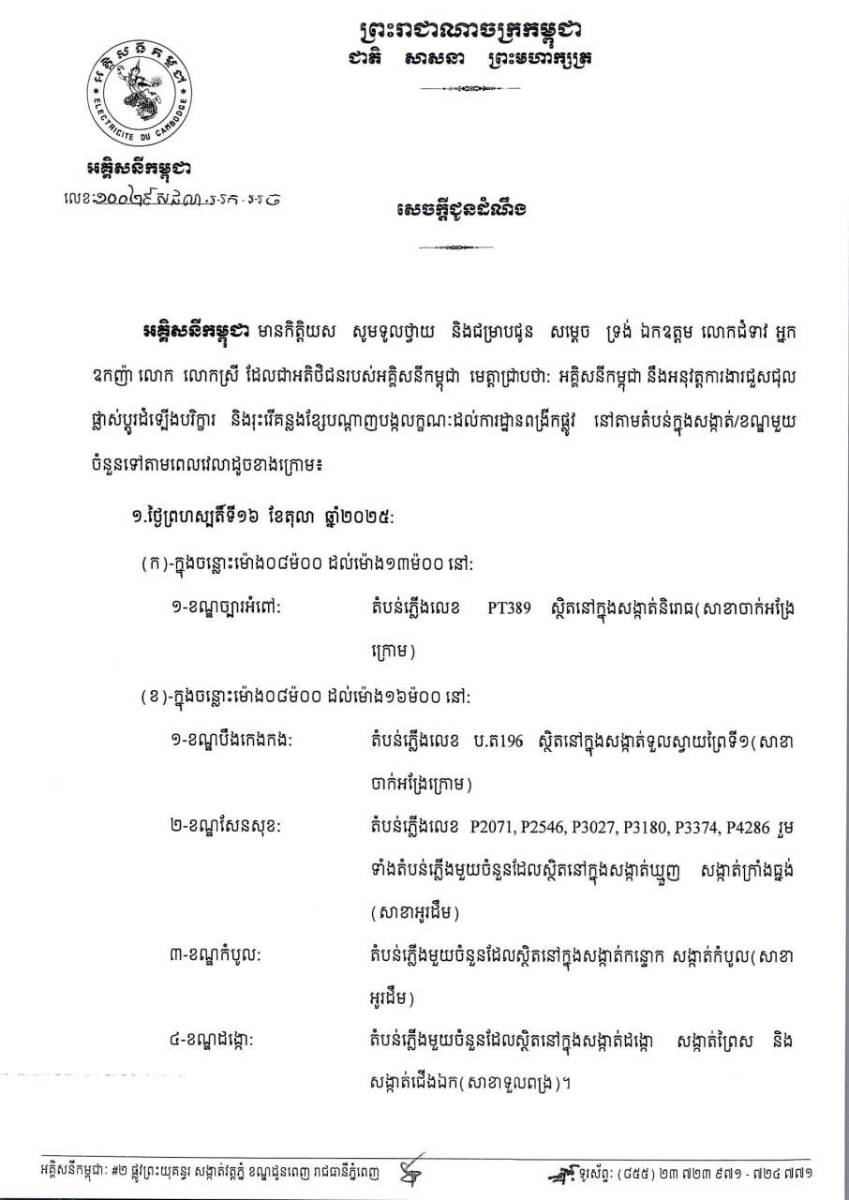 អគ្គិសនីកម្ពុជា នៅថ្ងៃទី១៤ ខែតុលា ឆ្នាំ២០២៥ នេះ បានចេញ សេចក្ដីជូនដំណឹង ជូន សម្តេច ទ្រង់ ឯកឧត្តម លោកជំទាវ អ្នក ឧកញ៉ា លោក លោកស្រី ដែលជាអតិថិជនរបស់អគ្គិសនីកម្ពុជា មេត្តាជ្រាបថាៈ អគ្គិសនីកម្ពុជា នឹងអនុវត្តការងារជួសជុល ផ្លាស់ប្តូរដំឡើងបរិក្ខា និងរុះរើគន្លងខ្សែបណ្តាញបង្កលក្ខណៈដល់ការដ្ឋានពង្រីកផ្លូវ នៅតាមតំបន់ក្នុងសង្កាត់/ខណ្ឌមួយចំនួន ចាប់ពីថ្ងៃទី១៦ ដល់ទី១៩ តុលា ឆ្នាំ២០២៥ នេះ។