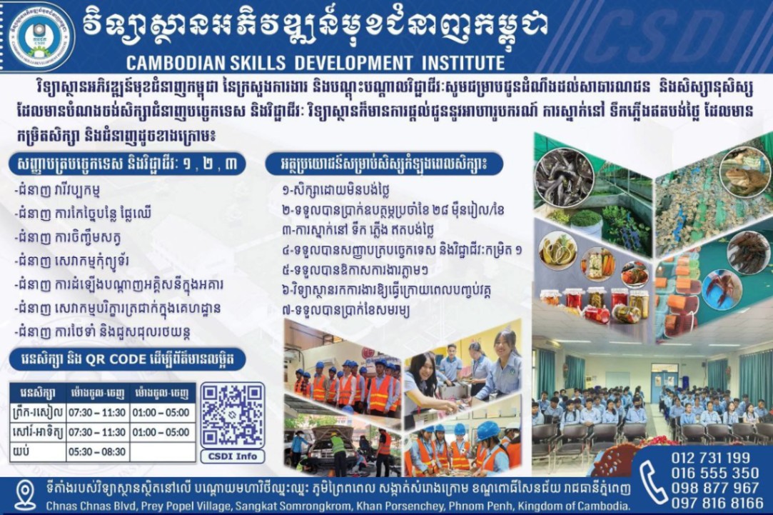 វិទ្យាស្ថានអភិវឌ្ឍន៍មុខជំនាញកម្ពុជា នៃក្រសួងការងារ និងបណ្តុះបណ្តាលវិជ្ជាជីវៈ ផ្តល់អាហារូបករណ៍ចំនួន ៦៩០កន្លែង លើ ៧មុខជំនាញ ដល់យុវជនមកពីគ្រួសារក្រីក្រ និងគ្រួសារងាយរងហានិភ័យ ព្រមទាំងផ្ដល់ប្រាក់ឧបត្ថម្ភប្រចាំខែក្រោមកម្មវិធីបណ្តុះបណ្តាលជំនាញវិជ្ជាជីវៈ និងបច្ចេកទេសដល់យុវជនមកពីគ្រួសារក្រីក្រ និងគ្រួសារងាយរងហានិភ័យ (TVET 1.5M)។ សម្រាប់ប្រជាពលរដ្ឋ និងយុវជន ដែលមិនមែនជាក្រុមគោលដៅ ក៏អាចស្នើចុះឈ្មោះចូលសិក្សាបានដោយឥតគិតថ្លៃផងដែរ ប៉ុន្តែមិនទទួលបានប្រាក់ឧបត្ថម្ភនោះឡើយ។