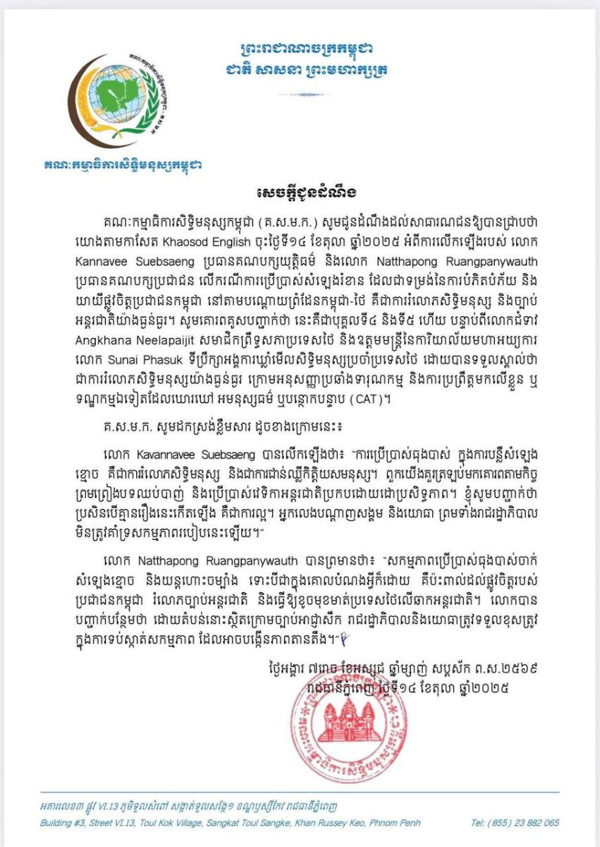 តាមសេចក្ដីជូនដំណឹងរបស់ គណៈកម្មាធិការសិទ្ធិមនុស្សកម្ពុជា (គ.ស.ម.ក.) បានឱ្យដឹងថា យោងតាមកាសែត Khaosod English ចុះថ្ងៃទី១៤ ខែតុលា ឆ្នាំ២០២៥ អំពីការលើកឡើងរបស់ លោក Kannavee Suebsaeng ប្រធានគណបក្សយុត្តិធម៌ និងលោក Natthapong Nat Ruangpanywauth ប្រធានគណបក្សប្រជាជន លើករណីការប្រើប្រាស់សំឡេងរំខាន ដែលជាទម្រង់នៃការបំភិតបំភ័យ និង យាយីផ្លូវចិត្តប្រជាជនកម្ពុជា នៅតាមបណ្តោយព្រំដែនកម្ពុជា-ថៃ គឺជាការរំលោភសិទ្ធិមនុស្ស និងច្បាប់ អន្តរជាតិយ៉ាងធ្ងន់ធ្ងរ។