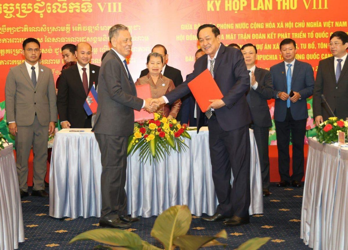 សម្តេចកិត្តិសង្គហបណ្ឌិត ម៉ែន សំអន ប្រធានក្រុមប្រឹក្សាជាតិរណសិរ្ស សាមគ្គីអភិវឌ្ឍន៍មាតុភូមិកម្ពុជា និង ឯកឧត្តម ឧត្តមសេនីយ៍ឯក Vo Minh Luong អនុរដ្ឋមន្ត្រីក្រសួងការពារប្រទេស ប្រធានគណៈប្រតិភូ បានដឹកនាំកិច្ចប្រជុំលើកទី ៨ ស្តីពីការអនុវត្តគម្រោងសាងសង់ ជួសជុល កែលំអរ លើកសោភណ្ឌភាពស្តូបមិត្តភាពនៅព្រះរាជាណាចក្រកម្ពុជា នៅទីក្រុងហូជីមិញ នាព្រឹកថ្ងៃពុធ ៨រោច ខែអស្សុជ ឆ្នាំម្សាញ់ សប្តស័ក ព.ស.២៥៦៩ ត្រូវនឹងថ្ងៃទី១៥ ខែតុលា ឆ្នាំ២០២៥។