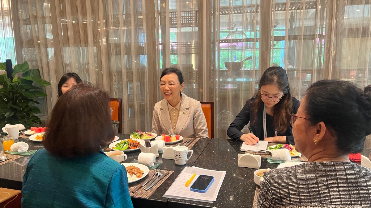 ក្នុងកំឡុងពេល នៃកិច្ចប្រជុំថ្នាក់ដឹកនាំពិភពលោកស្តីពីស្រ្តី (Global Leaders’ Meeting on Women) នៅទីក្រុងប៉េកាំង នៅថ្ងៃទី១៤ ខែតុលា ឆ្នាំ២០២៥ លោកជំទាវកិត្តិបណ្ឌិត អ៊ឹង កន្ថាផាវី រដ្ឋមន្រ្តីក្រសួងកិច្ចការនារី បានជួបជាមួយ លោកជំទាវ លីន យី អនុប្រធានសហព័ន្ធស្រ្តីទូទាំងចិន ក្នុងជំនួបបាយថ្ងៃត្រង់ទ្វេភាគី ដើម្បី ពង្រឹងកិច្ចសហប្រតិបត្តិការរវាងប្រទេសទាំងពីរ លើការងារលើកកម្ពស់សមភាពយេនឌ័រ និងតួនាទីស្រ្តី។