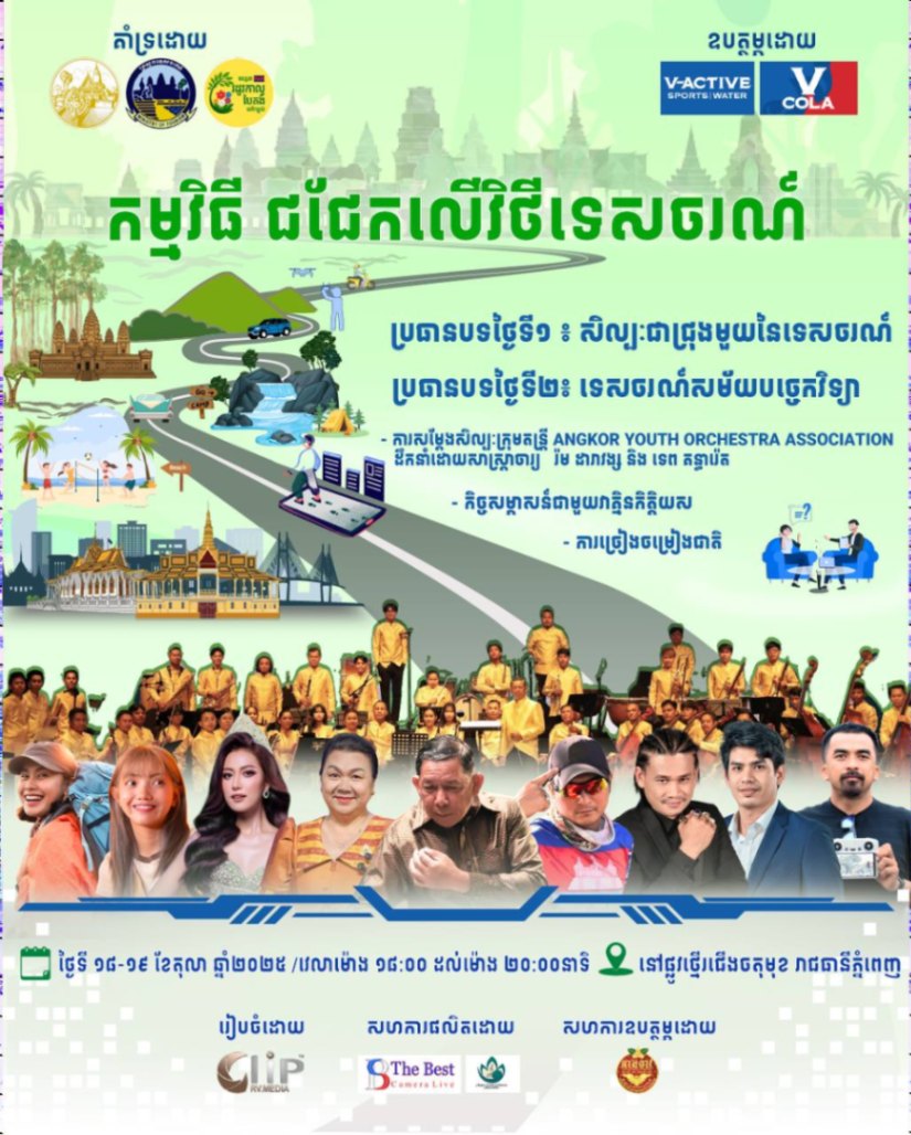 កម្មវិធីជជែកលើវិថីទេសចរណ៍ ក្រោមប្រធានបទ “សិល្បៈជាជ្រុងមួយនៃទេសចរណ៍” និង “ទេសចរណ៍សម័យបច្ចេកវិទ្យា” កម្មវិធី នឹងប្រារព្ធ នៅថ្ងៃទី១៨-១៩ ខែតុលា ឆ្នាំ២០២៥ វេលាម៉ោង ១៨:០០នាទី ដល់ម៉ោង ២០:០០នាទី នៅផ្លូវថ្មើរជើងចតុមុខ រាជធានីភ្នំពេញ។