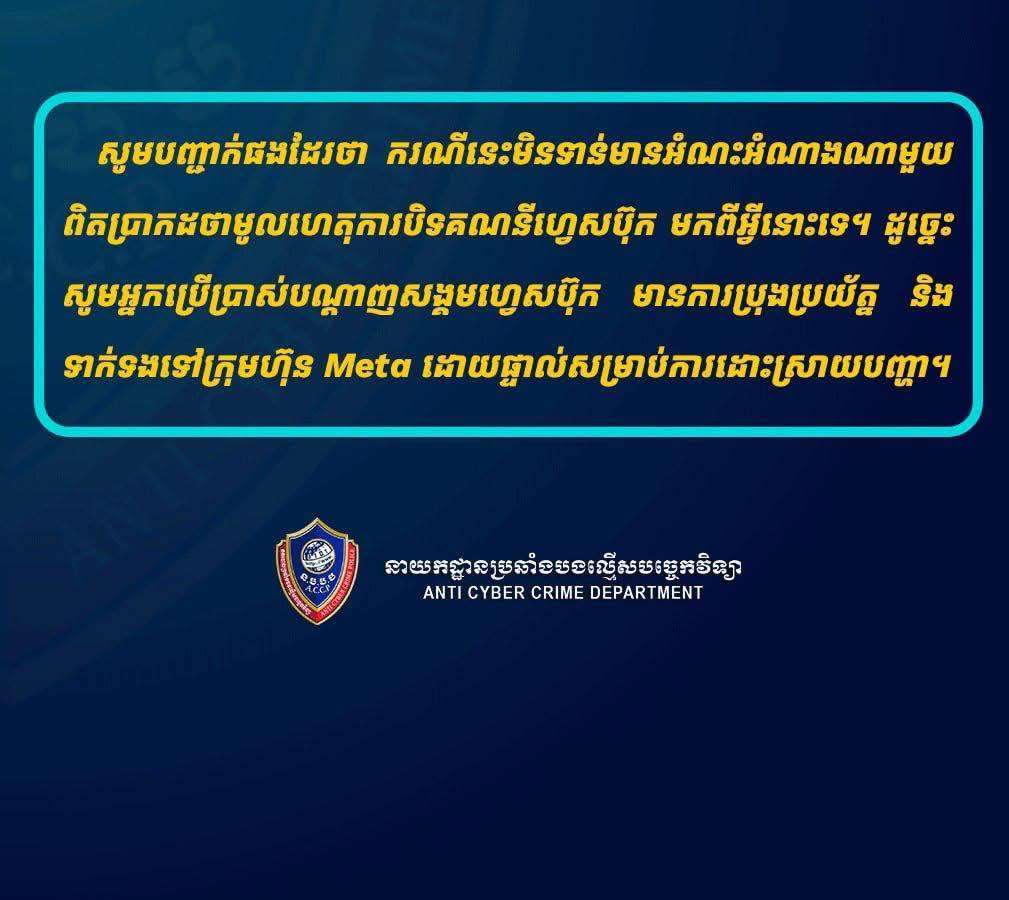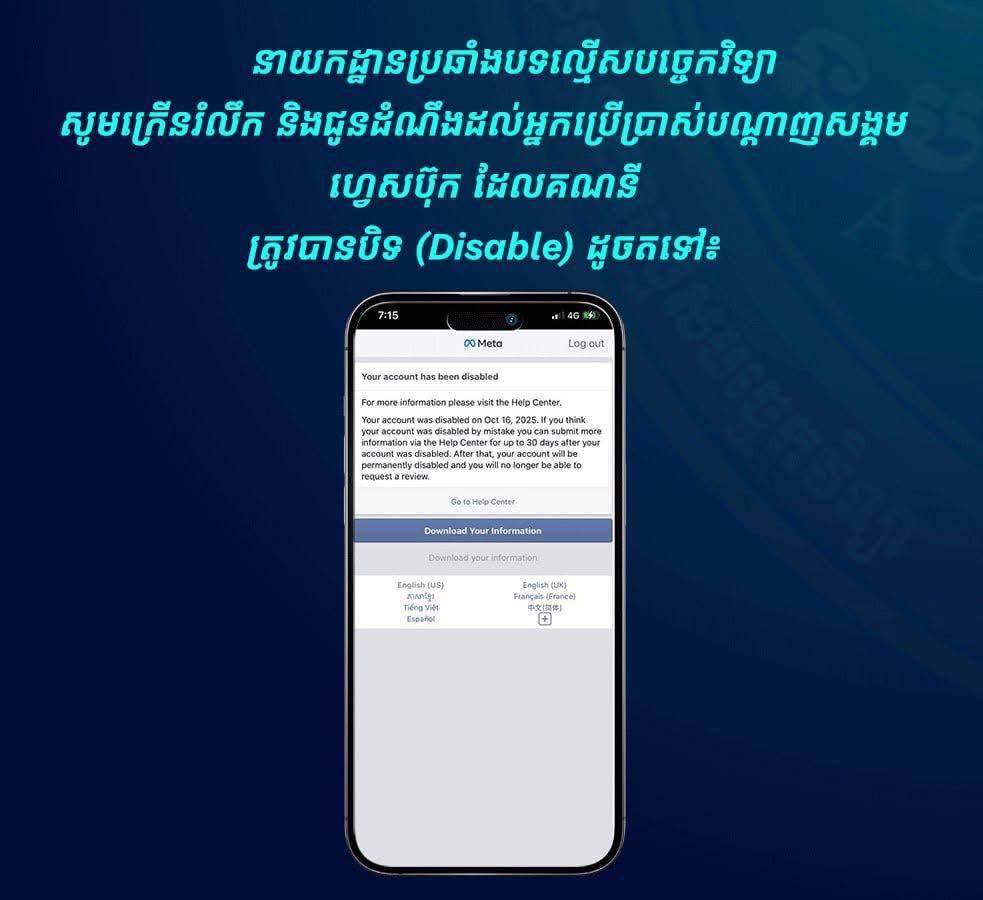 នាយកដ្ឋានប្រឆាំងបទល្មើសបច្ចេកវិទ្យា អគ្គស្នងការនគរបាលជាតិ នៅថ្ងៃទី១៨ ខែតុលា ឆ្នាំ២០២៥នេះ បានអំពាវនាវឲ្យមានការប្រុងប្រយ័ត្ន ខណៈថ្មីៗនេះគេសង្កេតឃើញមានការផ្សព្វផ្សាយពីអ្នកប្រើប្រាស់បណ្ដាញសង្គមហ្វេសប៊ុកជាច្រើនដែលគណនីរបស់ពួកគេត្រូវបានបិទ (Disable) ដោយមិនមានមូលហេតុច្បាស់លាស់។ ទន្ទឹមនឹងនេះនាយកដ្ឋានក៏បានសង្កេតឃើញថា មានបុគ្គលមួយចំនួនបានប្រើប្រាស់បណ្ដាញសង្គមដើម្បីផ្សព្វផ្សាយសេវាកម្មដោះស្រាយបញ្ហាគណនីហ្វេសប៊ុក ដែលត្រូវបានបិទ ដោយគិតថ្លៃសេវាកម្មចន្លោះពី ៥០០ដុល្លារ ដល់ ១,២០០ដុល្លារ។