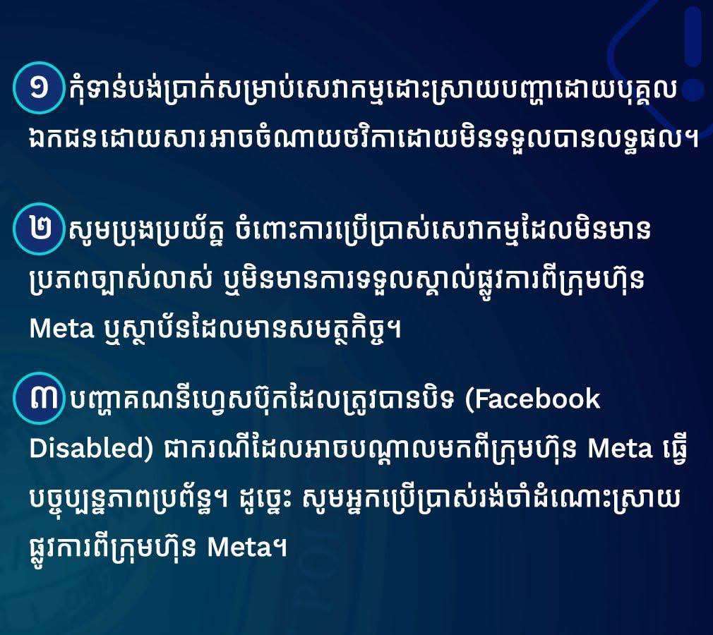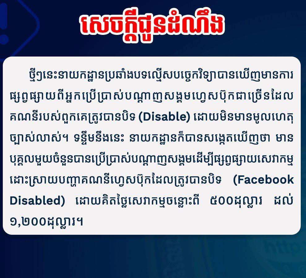 នាយកដ្ឋានប្រឆាំងបទល្មើសបច្ចេកវិទ្យា សូមក្រើនរំលឹក និងជូនដំណឹងដល់អ្នកប្រើប្រាស់បណ្ដាញសង្គមហ្វេសប៊ុក ដែលគណនីត្រូវបានបិទ (Disable) ដូចតទៅ៖១. កុំទាន់បង់ប្រាក់សម្រាប់សេវាកម្មដោះស្រាយបញ្ហាដោយបុគ្គលឯកជន ដោយសារ អាចចំណាយថវិកាដោយមិនទទួលបានលទ្ធផល។២. សូមប្រុងប្រយ័ត្ន ចំពោះការប្រើប្រាស់សេវាកម្មដែលមិនមានប្រភពច្បាស់លាស់ ឬមិនមានការទទួលស្គាល់ផ្លូវការពីក្រុមហ៊ុន Meta ឬស្ថាប័នដែលមានសមត្ថកិច្ច។ និងទី៣. បញ្ហាគណនីហ្វេសប៊ុកដែលត្រូវបានបិទ (Facebook Disabled)ជាករណីដែលអាចបណ្តាលមកពីក្រុមហ៊ុន Meta ធ្វើបច្ចុប្បន្នភាពប្រព័ន្ធ។ ដូច្នេះសូមអ្នកប្រើប្រាស់រង់ចាំដំណោះស្រាយផ្លូវការពីក្រុមហ៊ុន Meta។