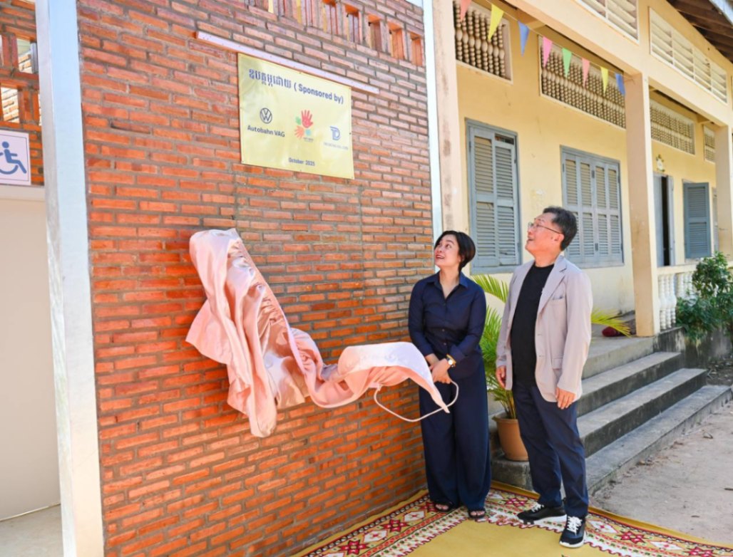 ភ្នំពេញ ៖ លោកគ្រូ-អ្នកគ្រូ និងសិស្សានុសិស្ស នៅវិទ្យាល័យតាំងក្រសាំង ស្ថិតនៅស្រុកសន្ទុក ខេត្តកំពង់ធំ ទទួលបានអគារបន្ទប់ទឹកស្អាត ដែលជាសមិទ្ធផលថ្មី នៃការចូលរួមលើកកម្ពស់បញ្ហាសុខភាព និងបរិស្ថាននៅក្នុងសាលារៀន ក្រោមគម្រោងគាំទ្រពី Autobahn VAG និង Tri Dong ។