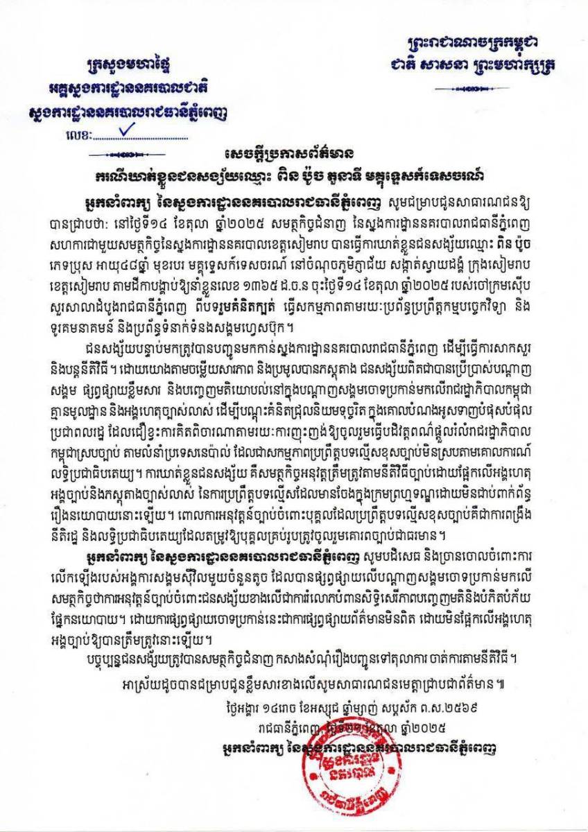 សមត្ថកិច្ចជំនាញ នៃស្នងការដ្ឋាននគរបាលរាជធានីភ្នំពេញ សហការជាមួយសមត្ថកិច្ច នៃស្នងការដ្ឋាននគរបាលខេត្តសៀមរាប នៅថ្ងៃទី១៤ ខែតុលា ឆ្នាំ២០២៥ បានធ្វើការ ឃាត់ខ្លួនជនសង្ស័យឈ្មោះ ពិន ប៉ូច ភេទប្រុស អាយុ៤៨ឆ្នាំ មុខរបរ មគ្គុទ្ទេសក៍ទេសចរណ៍ នៅចំណុចភូមិភ្ញាជ័យ សង្កាត់ស្វាយដង្គំ ក្រុងសៀមរាប ខេត្តសៀមរាប។