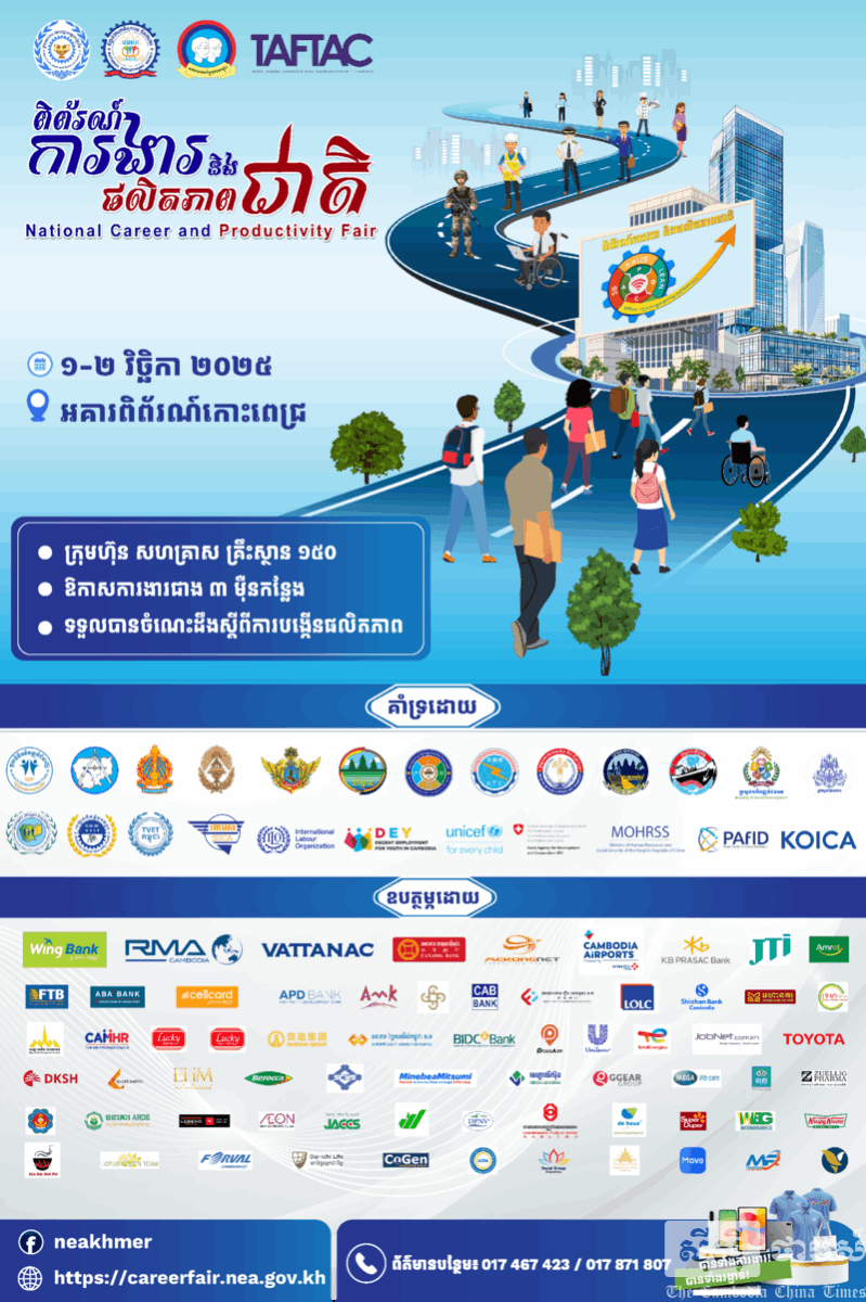 ទីភ្នាក់ងារជាតិមុខរបរ និងការងារ (NEA) នៃក្រសួងការងារ និងបណ្តុះបណ្តាលវិជ្ជាជីវៈ សហភាពសហព័ន្ធយុវជនកម្ពុជារាជធានីភ្នំពេញ និងដៃគូពាក់ព័ន្ធជាច្រើនផ្សេងទៀត សហការគ្នានឹងរៀបចំកម្មវិធីពិព័រណ៍ការងារ និងផលិតភាពជាតិ រយៈពេល២ថ្ងៃ ចាប់ពីថ្ងៃទី១ និងទី២ ខែវិច្ឆិកា ឆ្នាំ២០២៥ខាងមុខ នៅអគារមជ្ឈមណ្ឌលពិព័រណ៍កោះពេជ្រ ក្រោមប្រធានបទ «វិថីឆ្ពោះទៅរកផលិតភាព៖ ផ្សារភ្ជាប់ជំនាញ បច្ចេកវិទ្យា និងឱកាសការងារ»។