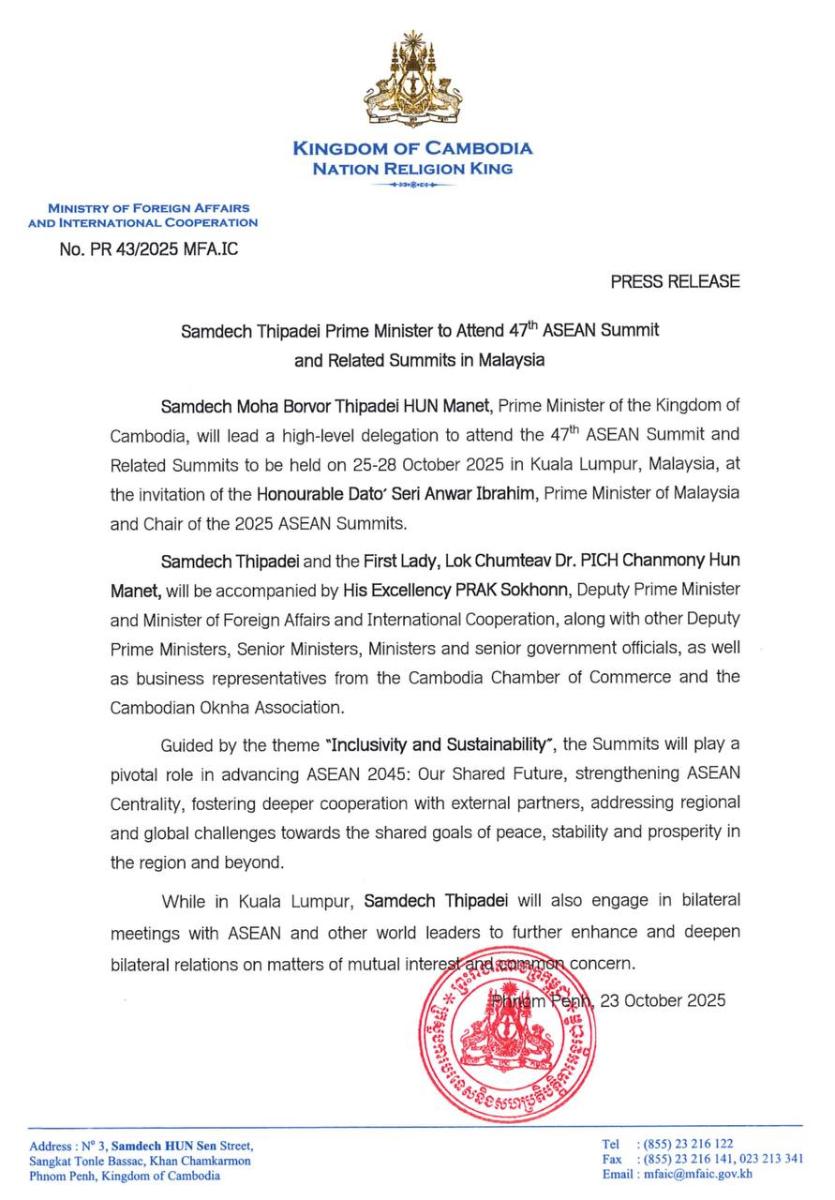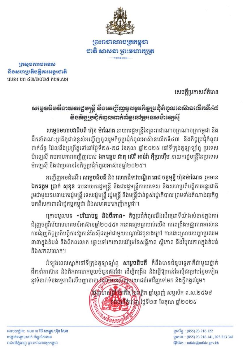 ភ្នំពេញ៖ សម្តេចមហាបវរធិបតី ហ៊ុន ម៉ាណែត នាយករដ្ឋមន្ត្រី នៃព្រះរាជាណាចក្រកម្ពុជា នឹង ដឹកនាំគណៈប្រតិភូជាន់ខ្ពស់ អញ្ជើញចូលរួមកិច្ចប្រជុំកំពូលអាស៊ានលើកទី៤៧ និងកិច្ចប្រជុំកំពូលពាក់ព័ន្ធ ដែលនឹងប្រព្រឹត្តទៅនៅថ្ងៃទី២៥-២៨ ខែតុលា ឆ្នាំ២០២៥ នៅទីក្រុងគូឡាឡាំពួ ប្រទេសម៉ាឡេស៊ី តបតាមការអញ្ជើញរបស់ ឯកឧត្តម ដាតុ ស៊េរី អាន់វ៉ា អ៊ីប្រាហ៊ីម នាយករដ្ឋមន្ត្រីនៃប្រទេស ម៉ាឡេស៊ី និងជាប្រធាននៃកិច្ចប្រជុំកំពូលអាស៊ានឆ្នាំ២០២៥។ នេះបើតាមសេចក្ដីប្រកាសព័ត៌មានរបស់ក្រសួងការបទេសកម្ពុជា។