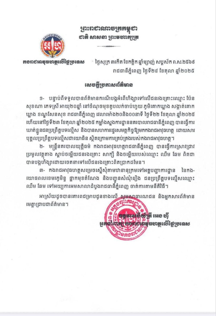 នៅថ្ងៃទី២៤ ខែតុលា ឆ្នាំ២០២៥នេះ កងរាជអាវុធហត្ថលើផ្ទៃប្រទេស បានបញ្ជាក់ថា បន្ទាប់ពីទទួលបានព័ត៌មានករណីបង្កអំពើហិង្សាទៅលើជនរងគ្រោះឈ្មោះ ប៉ែន សុខណា ភេទស្រី អាយុ២០ឆ្នាំ នៅចំណុចមុខតូបលក់ចាប់ហួយ ភូមិគោកឃ្លាង សង្កាត់គោក ឃ្លាង ខណ្ឌសែនសុខ រាជធានីភ្នំពេញ វេលាម៉ោង២០និង០០នាទី ថ្ងៃទី២២ ខែតុលា ឆ្នាំ២០២៥ ហើយនៅថ្ងៃទី២៣ ខែតុលា ឆ្នាំ២០២៥ កម្លាំងស្នងការដ្ឋាននគរបាលរាជធានីភ្នំពេញ បានធ្វើការ ឃាត់ខ្លួនជនប្រព្រឹត្តបទល្មើស និងបានសហការផ្ទេរសមត្ថកិច្ចឱ្យមកកងរាជអាវុធហត្ថ ដោយសារ បុគ្គលប្រព្រឹត្តបទល្មើសជាយោធិន ស្ថិតក្រោមការគ្រប់គ្រងរបស់កងរាជអាវុធហត្ថ។