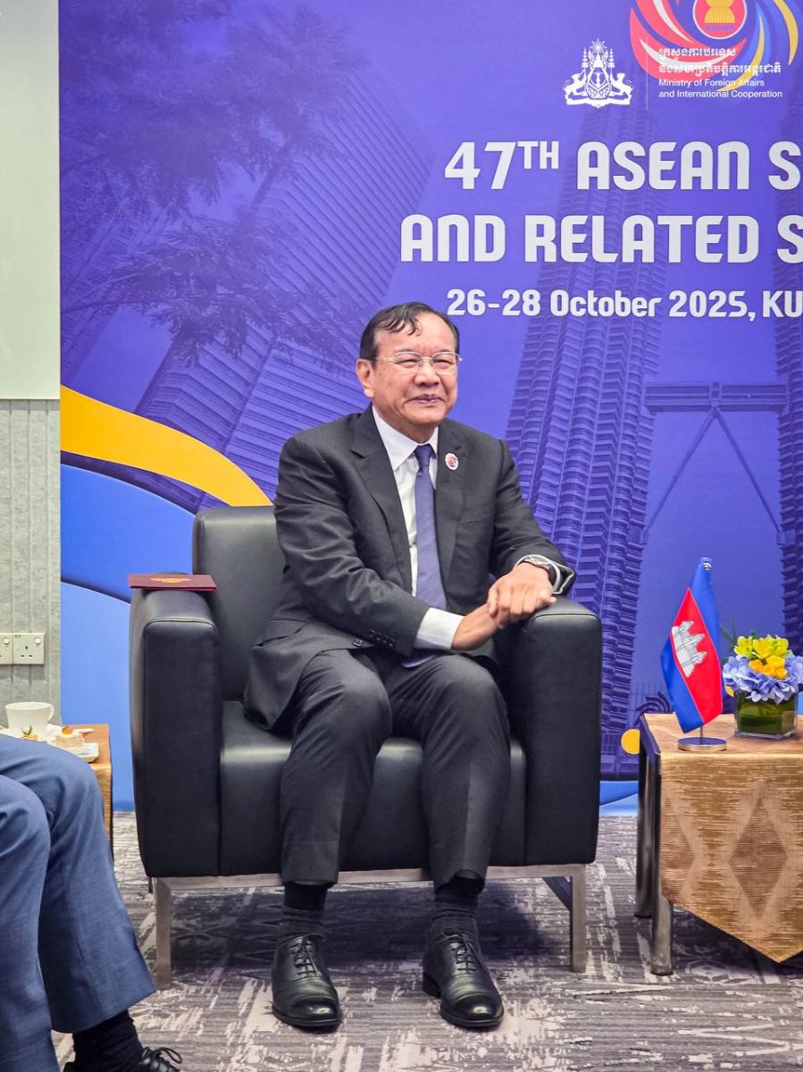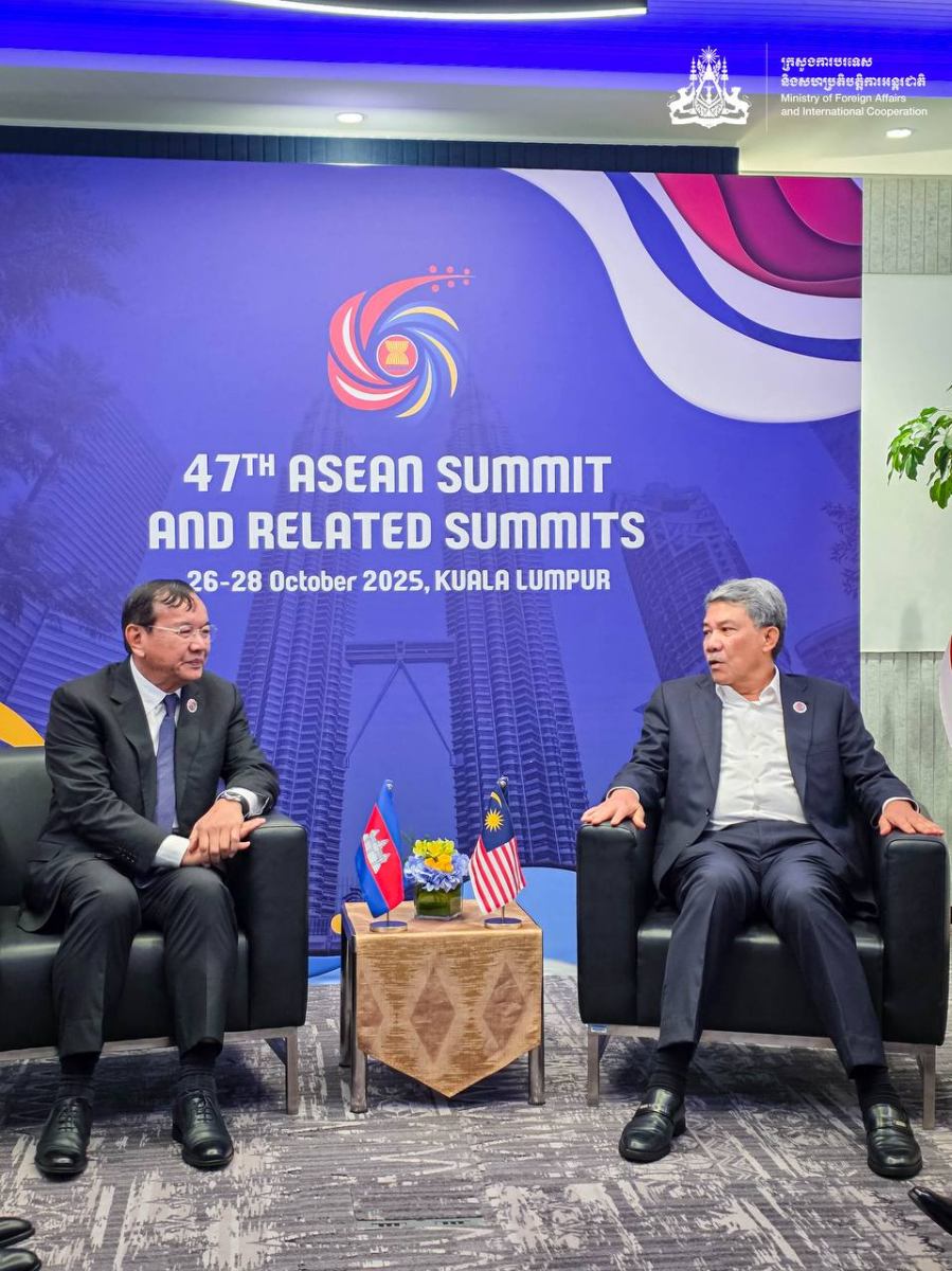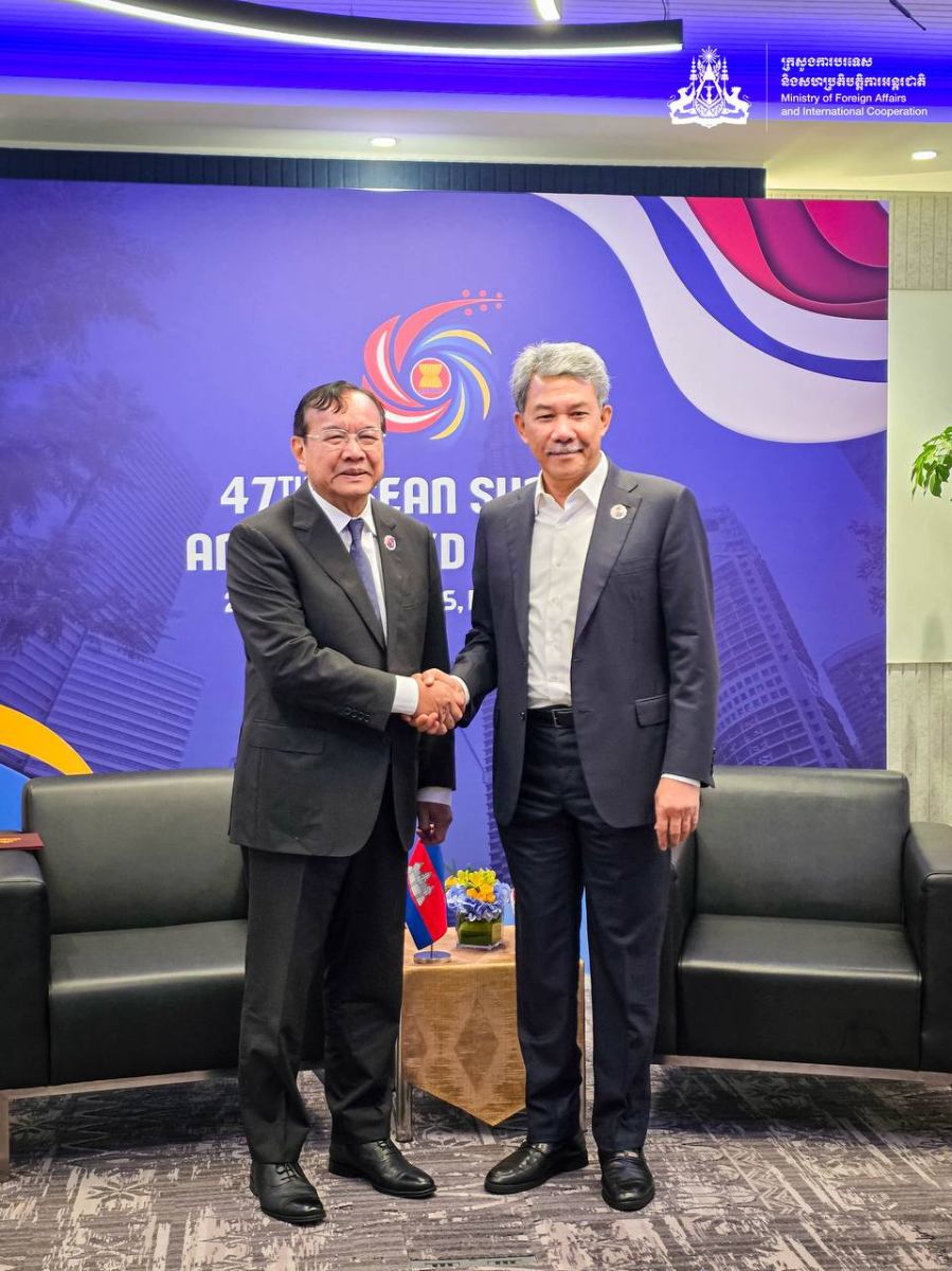 នៅរសៀលថ្ងៃទី ២៤ ខែតុលា ឆ្នាំ២០២៥ ឯកឧត្តមឧបនាយករដ្ឋមន្ត្រី ប្រាក់ សុខុន រដ្ឋមន្ត្រីការបរទេស និងសហប្រតិបត្តិការអន្តរជាតិ បានអញ្ជើញជួបពិភាក្សាក្រៅផ្លូវការជាមួយ ឯកឧត្តម Dato’ Seri Utama Haji Mohamad bin Haji Hasan រដ្ឋមន្ត្រីការបរទេសម៉ាឡេស៊ី ក្នុងឱកាសអញ្ជើញចូលរួមកិច្ចប្រជុំកំពូលអាស៊ាន លើកទី៤៧ និងកិច្ចប្រជុំពាក់ព័ន្ធ នៅទីក្រុងគូឡាឡាំពួ ប្រទេសម៉ាឡេស៊ី។