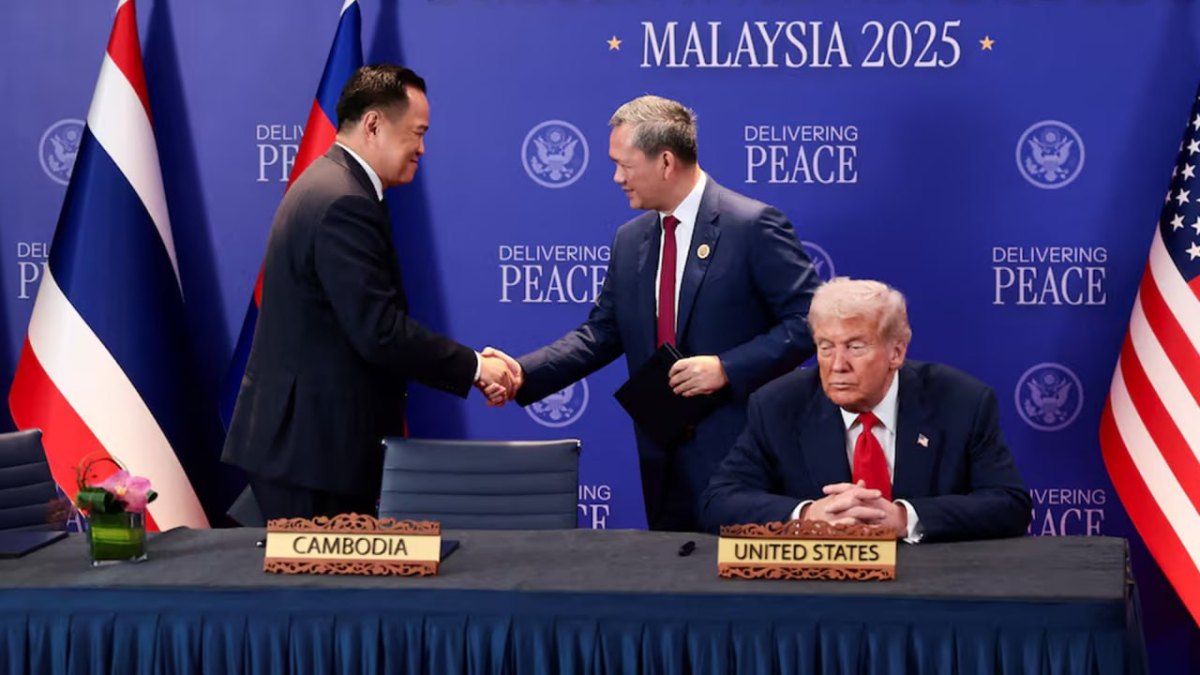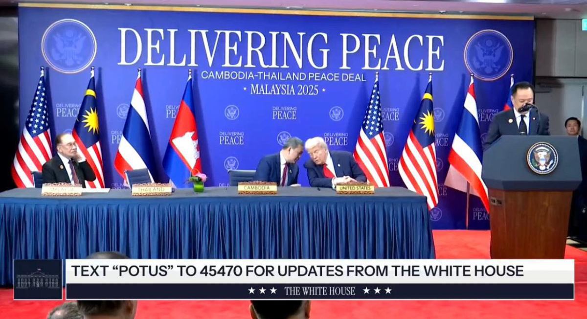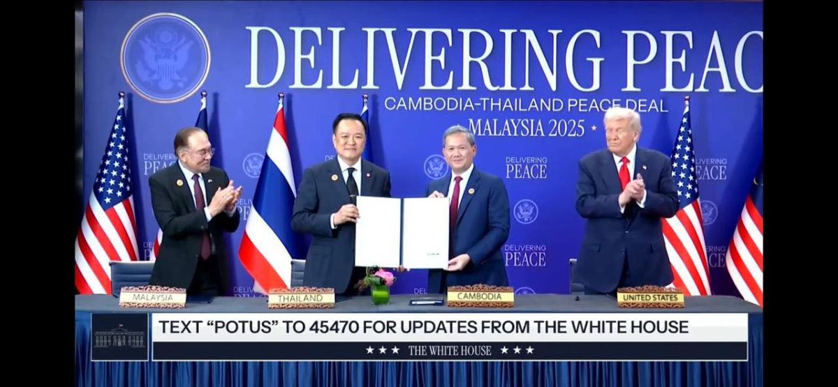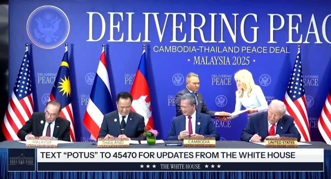 សូមបញ្ជាក់ថា កម្ពុជា-ថៃ ចុះហត្ថលេខាលើកិច្ចព្រមព្រៀងសន្តិភាព ក្រោមអធិបតីភាពសម្ដេចមហាបវរធិបតី ហ៊ុន ម៉ាណែត នាយករដ្ឋមន្រ្ដីនៃកម្ពុជា និងនាយករដ្ឋមន្ត្រីថៃ លោក អនុទីន ឆានវីរៈគុល និងអធិបតីភាពសាក្សីពីសំណាក់លោកប្រធានាធិបតីអាមេរិក ដូណាល់ ត្រាំ និងឯកឧត្តម អាន់វ៉ា អ៊ីប្រាហ៊ីម នាយករដ្ឋមន្រ្តី នៃប្រទេសម៉ាឡេស៊ី និងជាប្រធានប្តូរវេនអាស៊ាន នៅទីក្រុងកូឡាឡាំពួ ប្រទេសម៉ាឡេស៊ី ថ្ងៃអាទិត្យ ទី២៦ ខែតុលា ឆ្នាំ២០២៥៕