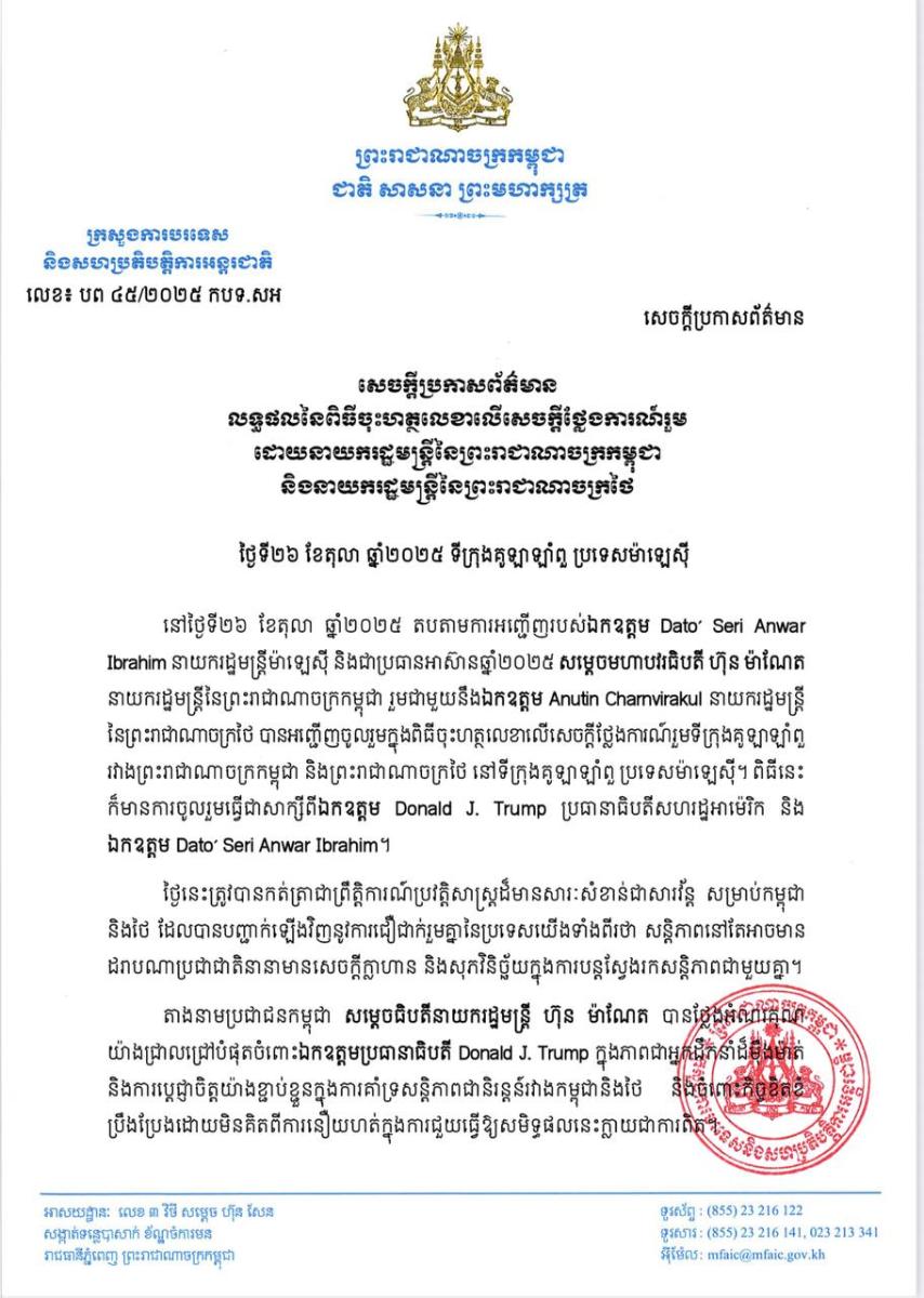 សេចក្តីប្រកាសព័ត៌មាន បញ្ជាក់ថា ថ្ងៃនេះត្រូវបានកត់ត្រាជាព្រឹត្តិការណ៍ប្រវត្តិសាស្ត្រដ៏មានសារៈសំខាន់ជាសារវ័ន្តសម្រាប់កម្ពុជា និងថៃ ដែលបានបញ្ជាក់ឡើងវិញនូវការជឿជាក់រួមគ្នានៃប្រទេសយើងទាំងពីរថា «សន្តិភាពនៅតែអាចមានដរាបណាប្រជាជាតិនានាមានសេចក្តីក្លាហាន និងសុភវិនិច្ឆ័យក្នុងការបន្តស្វែងរកសន្តិភាពជាមួយគ្នា»។